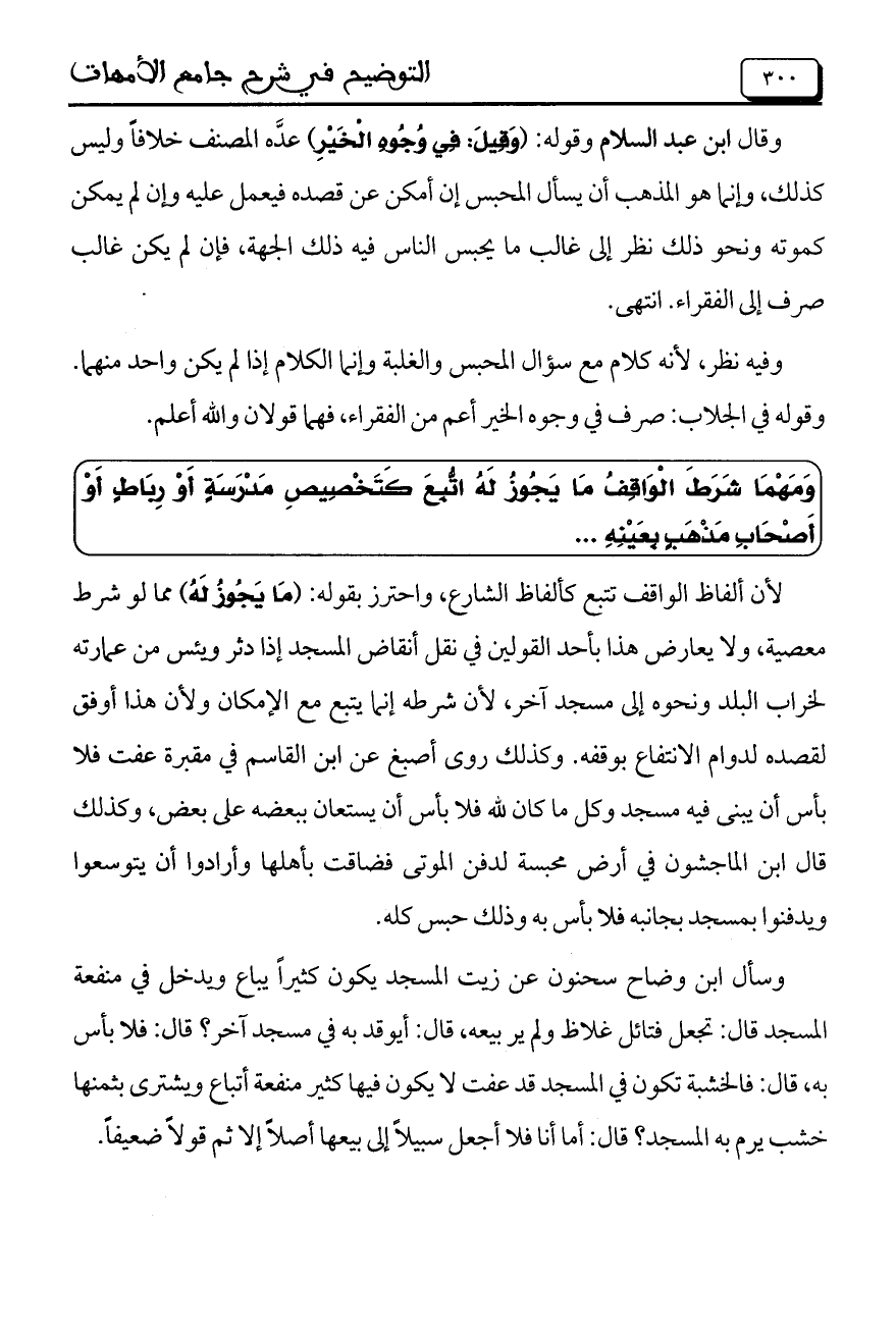 وقال ابن عبد السلام وقوله: (وَقِيلَ: فِي وُجُوهِ الْخَيْرِ) عدَّه المصنف خلافاً وليس كذلك، وإنما هو المذهب أن يسأل المحبس إن أمكن عن قصده فيعمل عليه وإن لم يمكن كموته ونحو ذلك نظر إلى غالب ما يحبس الناس فيه ذلك الجهة، فإن لم يكن غالب صرف إلى الفقراء. انتهى.