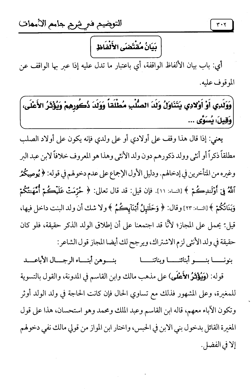 يعني: إذا قال هذا وقف على أولادي أو على ولدي فإنه يكون على أولاد الصلب مطلقاً ذكراً أو أنثى وولد ذكورهم دون ولد الأنثى وهذا هو المعروف خلافاً لابن عبد البر وغيره من المتأخرين في إدخالهم. ودليل الأول الإجماع على عدم دخولهم في قوله: {يُوصِيكُمْ اللَّهُ فِي أَوْلادِكُمْ} [النساء: 11]. فإن قيل: قد قال تعالى: {حُرِّمَتْ عَلَيْكُمْ أُمَّهَاتُكُمْ وَبَنَاتُكُمْ} [النساء: 23] وقال: {وَحَلائِلُ أَبْنَائِكُمْ} ولاشك أن ولد البنت داخل فيها، قيل: يحمل على المجاز؛ لأنَّا قد اجتمعنا على أن إطلاق الولد الذكر حقيقة، فلو كان حقيقة في ولد الأنثى لزم الاشتراك، ويرجح لك أيضاً المجاز قول الشاعر: