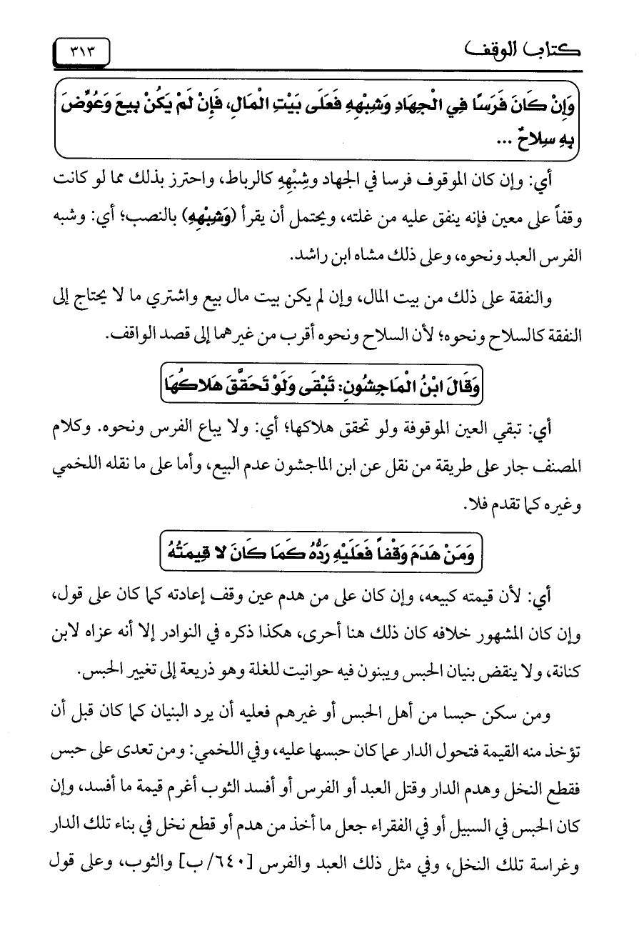 ومن سكن حبساً من أهل الحبس أو غيرهم فعليه أن يرد البنيان كما كان قبل أن تؤخذ منه القيمة فتحول الدار عما كان حبسها عليه، وفي اللخمي: ومن تعدى على حبس فقطع النخل وهدم الدار وقتل العبد أو الفرس أو أفسد الثوب أغرم قيمة ما أفسد، وإن كان الحبس في السبيل أو في الفقراء جعل ما أخذ من هدم أو قطع نخل في بناء تلك الدار وغراسة تلك النخلن وفي مثل ذلك العبد والفرس [640/ب] والثوب، وعلى قول
