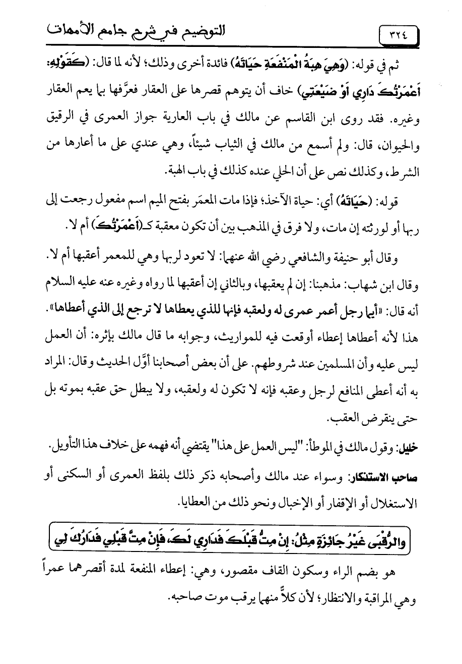 ثم في قوله: (وَهِيَ هِبَةُ الْمَنْفَعَةِ حَيَاتَهُ) فائدة أخرى وذلك؛ لأنه لما قال: (كَقَوْلِهِ: أَعْمَرْتُكَ دَارِي أَوْ ضَيْعَتِي) خاف أن يتوهم قصرها على العقار فعرَّفها بما يعم العقار وغيره. فقد روى ابن القاسم عنمالك في باب العارية جواز العمرى في الرقيق والحيوان، قال: ولم أسمع من مالك في الثياب شيئاً، وهي عندي على ما أعارها من الشرط، وكذلك نص على أن الحلي عنده كذلك في باب الهبة.