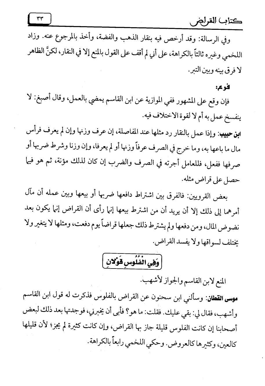 موسى القطان: وسألني ابن سحنون عن القراض بالفلوس فذكرت له قول ابن القاسم وأشهب، فقال لي: بقي عليك. فقلت: ما هو؟ فأبى أن يخبرني، فوجدتها بعد ذلك لبعض أصحابنا إن كانت الفلوس قليلة جاز بها القراض، وإن كانت كثيرة لم يجز؛ لأن قليلها كالعين، وكثيرها كالعروض. وحكي اللخمي رابعاً بالكراهة.