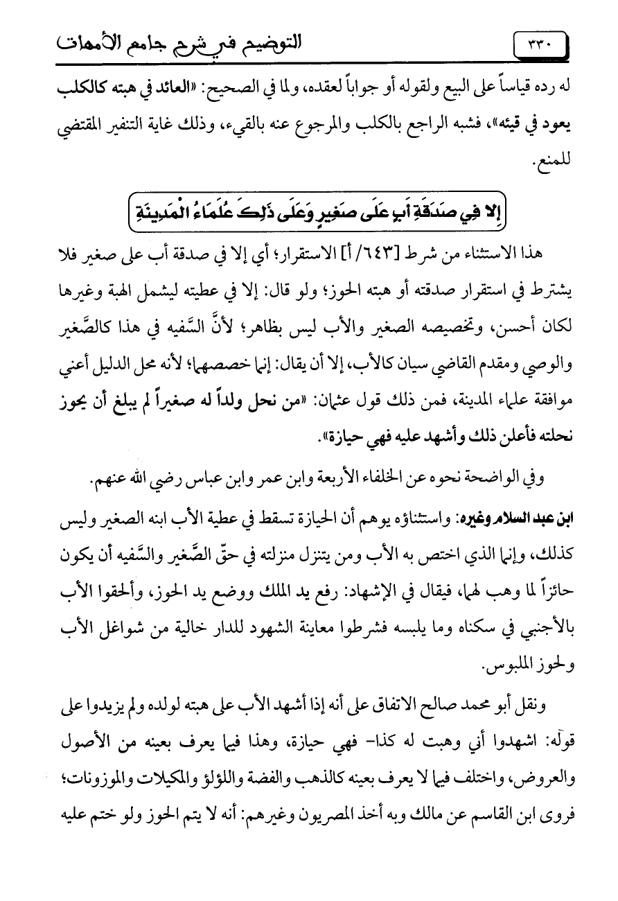 ابن عبد السلام وغيره: واستثناؤه يوهم أن الحيازة تسقط في عطية الأب ابنه الصغير وليس كذلك، وإنما الذي اختص به الأب ومن يتنزل منزلته في حقّ الصَّغير والسَّفيه أن يكون حائزاً لما وهب لهما، فيقال في الإشهاد: رفع يد الملك ووضع يد الحوز، وألحقوا الأب بالأجنبي في سكناه وما يلبسه فشرطوا معاينة الشهود للدار خالية من شواغل الأب ولحوز الملبوس.