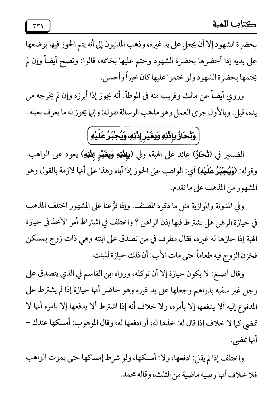 بحضرة الشهود إلا أن يجعل على يد غيره، وذهب المدنيون إلى أنه يتم الحوز فيها بوضعها على يديه إذا أحضرها بحضرة الشهود وختم عليها بخاتمه، قالوا: وتصح أيضاً وإن لم يختمها بحضرة الشهود ولو ختموا عليها كان خيراً وأحسن.