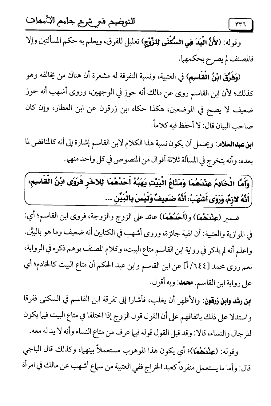 ابن عبد السلام: ويحتمل أن يكون نسبة هذا الكلام لابن القاسم إشارة إلى أنه كالمناقض لما بعده، وأنه يتخرج في المسألة ثلاثة أقوال من المنصوص في كل واحد منهما.