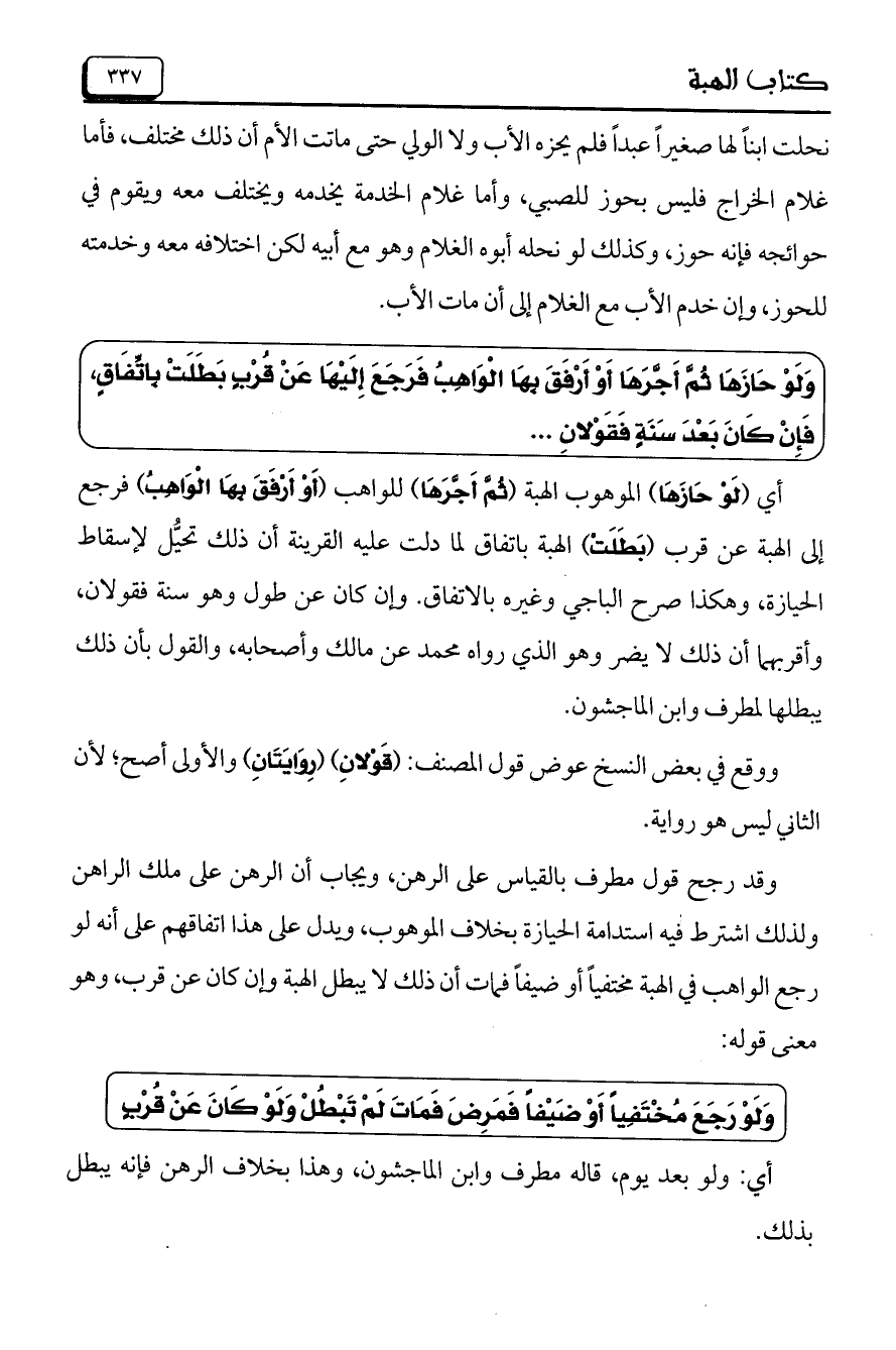 وقد رجح قول مطرف بالقياس على الرهن، ويجاب أن الرهن على ملك الراهن ولذلك اشترط فيه استدامة الحيازة بخلاف الموهوب، ويدل على هذا اتفاقهم على أنه لو رجع الواهب في الهبة مختفياً أو ضيفاً فمات أن ذلك لا يبطل الهبة وإن كان عن قرب، وهو معنى قوله: