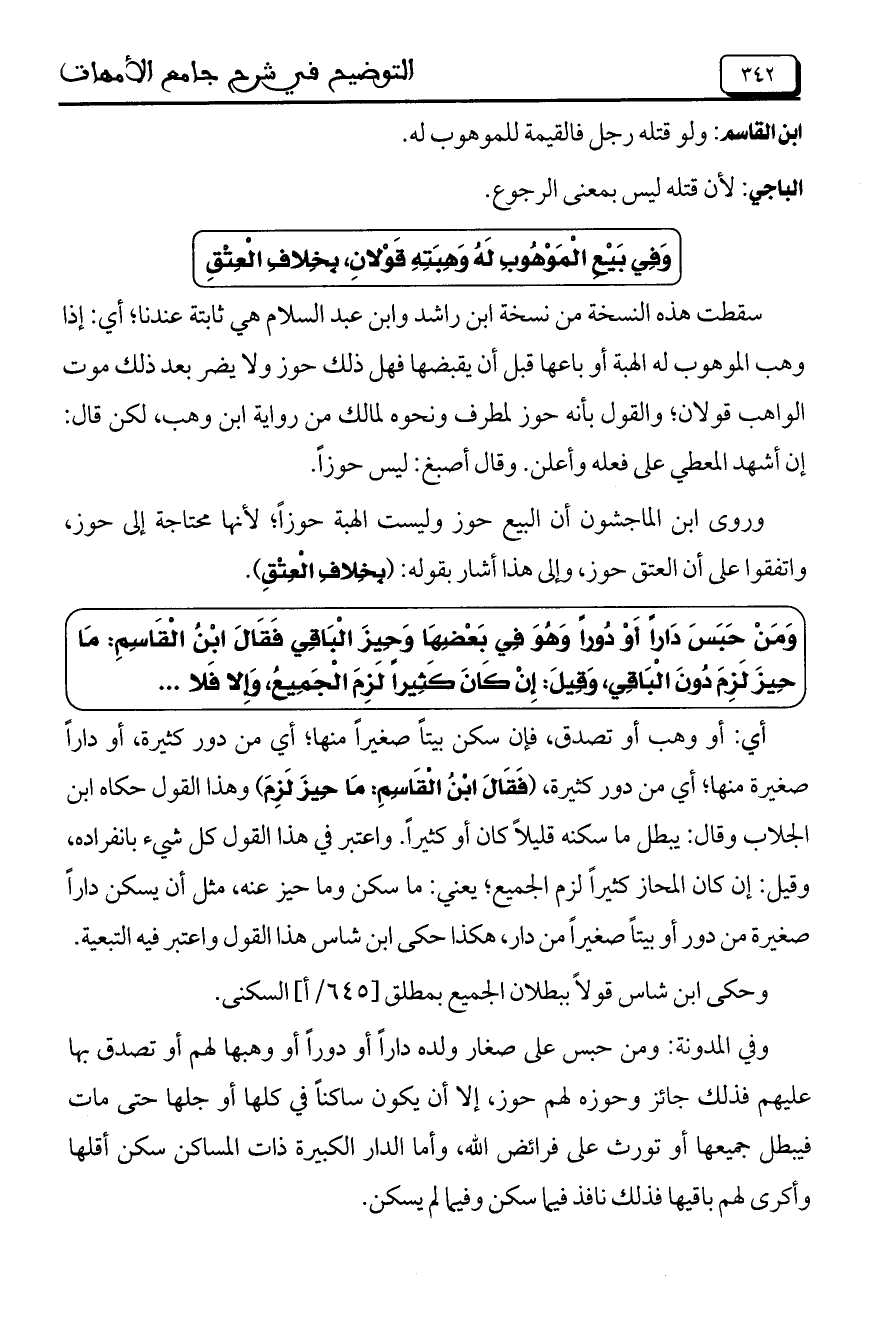 وَمَنْ حَبَسَ دَاراً أَوْ دُوراً وَهُوَ فِي بَعْضِهَا وَحِيزَ الْبَاقِي فَقَالَ ابْنُ الْقَاسِمِ: مَا حِيزَ لَزِمَ دُونَ الْبَاقِي، وَقِيلَ: إِنْ كَانَ كَثِيراً لَزِمَ الْجَمِيعُ، وَإِلا فَلا ...
