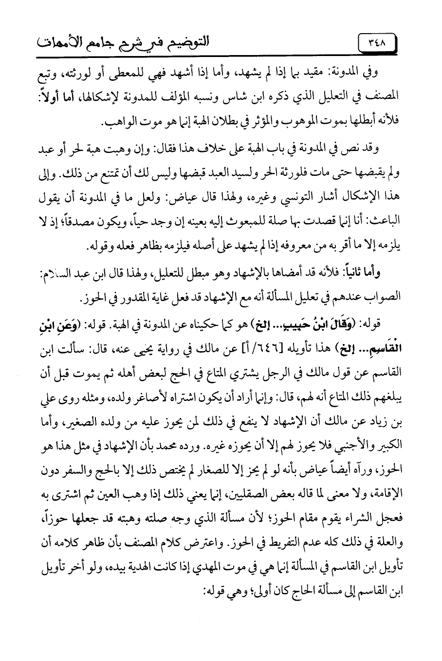 قوله: (وَقَالَ ابْنُ حَبِيبٍ .. إلخ) هو كما حكيناه عن المدونة في الهبة. قوله: (وَعَنِ ابْنِ الْقَاسِمِ .. إلخ) هذا تأويله [646/أ] عن مالك في رواية يحيى عنه، قال: سألت ابن القاسم عن قول مالك في الرجل يشتري المتاع في الحج لبعض أهله ثم يموت قبل أن يبلغهم ذلك المتاع أنهم لهم، قال: وإنما أراد أن يكون اشتراه لأصاغر ولده، ومثله روى علي بن زياد عن مالك أن الإشهاد لا ينفع في ذلك لمن يحوز عليه من ولده الصغير، وأما الكبير والأجنبي فلا يحوز لهم إلا أن يحوزه غيره. ورده محمد بأن الإشهاد في مثل هذا هو الحوز، ورآه أيضاً عياض بأنه لو لم يحز إلا للصغار لم يختص ذلك إلا بالحج والسفر دون الإقامة، ولا معنى لما قاله بعض الصقليين، إنما يعني ذلك إذا وهب العين ثم اشترى به فعجل الشراء يقوم مقام الحوز؛ لأن مسألة الذي وجه صلته وهبته قد جعلها حوزاً، والعلة في ذلك كله عدم التفريط في الحوز. واعترض كلام المصنف بأن ظاهر كلامه أن تأويل ابن القاسم في المسألة إنما هي في موت المهدي إذا كانت الهدية بيده، ولو أخر تأويل ابن القاسم إلى مسألة الحاج كان أولى؛ وهي قوله: