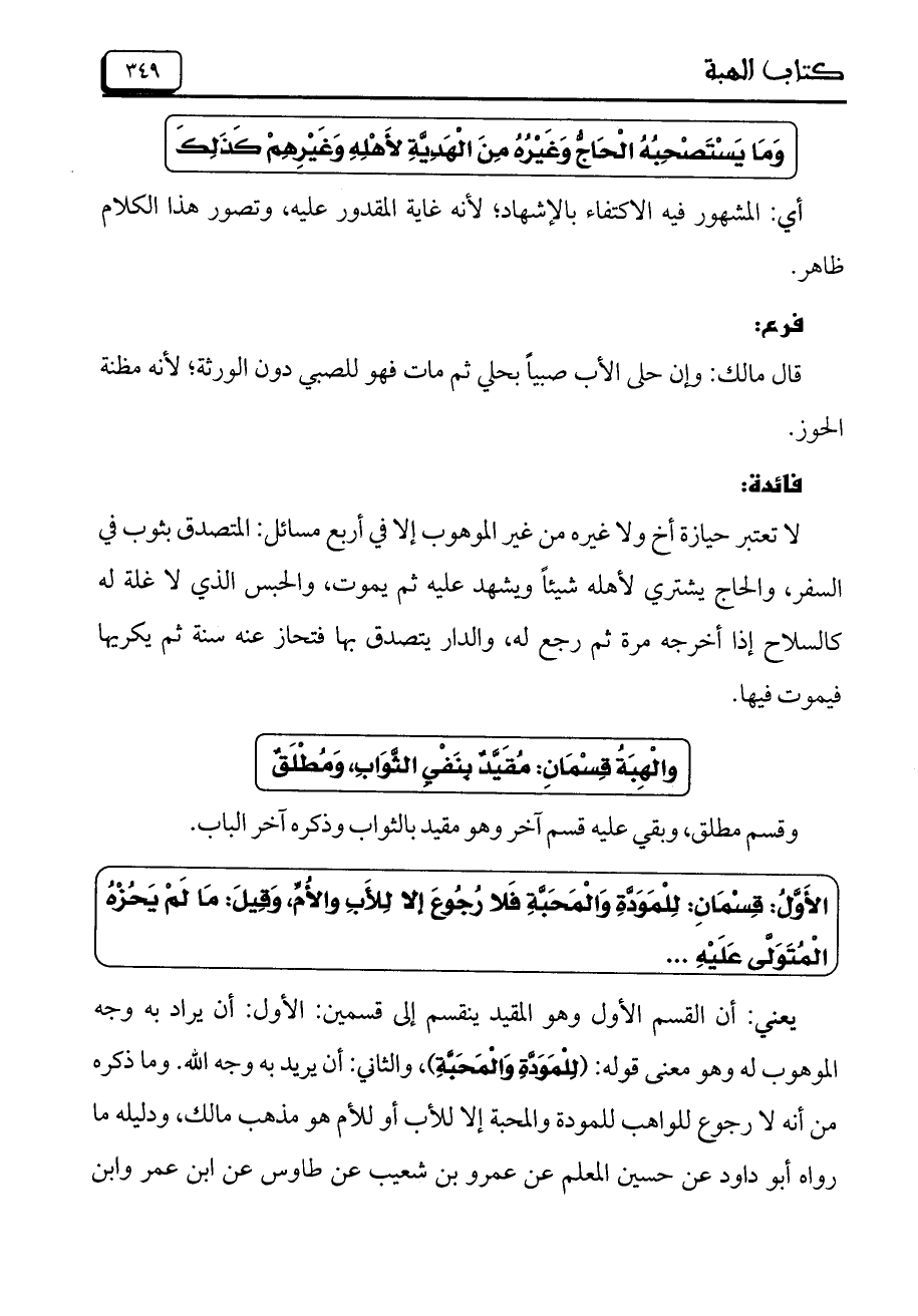 يعني: أن القسم الأول وهو المقيد ينقسم إلى قسمين: الأول: أن يراد به وجه الموهوب له وهو معنى قوله: (لِلْمَوَدَّةِ وَالْمَحَبَّةِ)، والثاني: أن يريد به وجه الله. وما ذكره من أنه لا رجوع للواهب للمودة والمحبة إلا للأب أو للأم هو مذهب مالك، ودليله ما رواه أبو داود عن حسين المعلم عن عمرو بن شعيب عن طاوس عن ابن عمر وابن