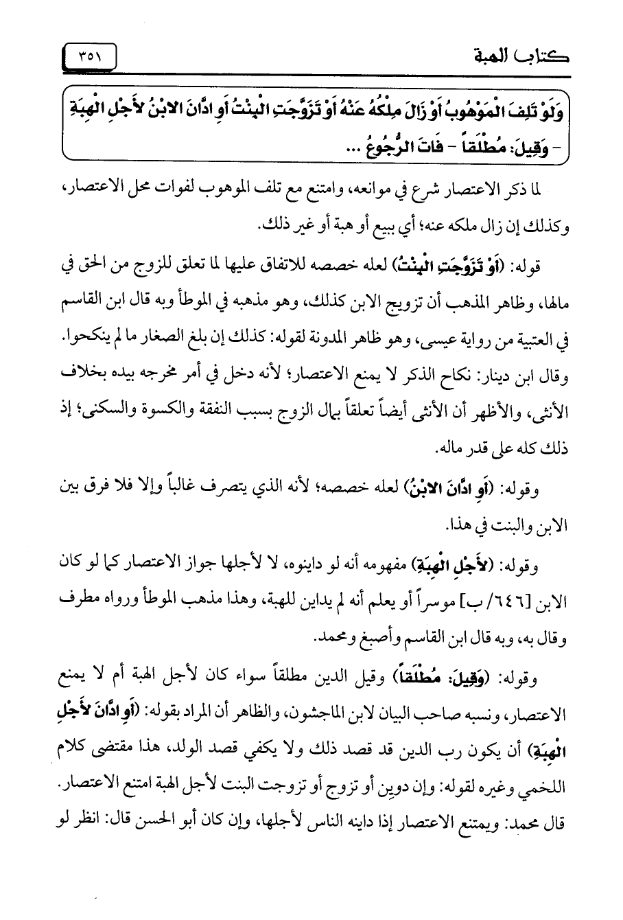 قوله: (أَوْ تَزَوَّجَتِ الْبِنْتُ) لعله خصصه للاتفاق عليها لما تعلق للزوج من الحق في مالها، وظاهر المذهب أن تزويج الابن كذلك، وهو مذهبه في الموطأ وبه قال ابن القاسم في العتبية من رواية عيسى، وهو ظاهر المدونة لقوله: كذلك إن بلغ الصغار ما لم ينكحوا. وقال ابن دينار: نكاح الذكر لا يمنع الاعتصار؛ لأنه دخل في أمر مخرجه بيده بخلاف الأنثى، والأظهر أن الأنثى أيضاً تعلقاً بمال الزوج بسبب النفقة والكسوة والسكنى؛ إذ ذلك كله على قدر ماله.