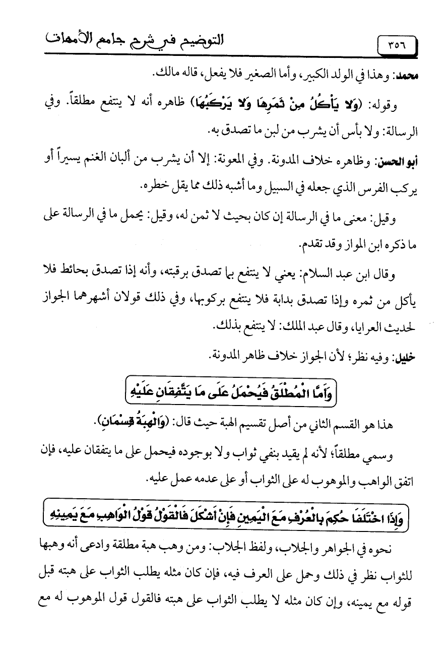 وقال ابن عبد السلام: يعني لا ينتفع بما تصدق برقبته، وأنه إذا تصدق بحائط فلا يأكل من ثمره وإذا تصدق بدابة فلا ينتفع بركوبها، وفي ذلك قولان أشهرهما الجواز لحديث العرايا، وقال عبد الملك: لا ينتفع بذلك.