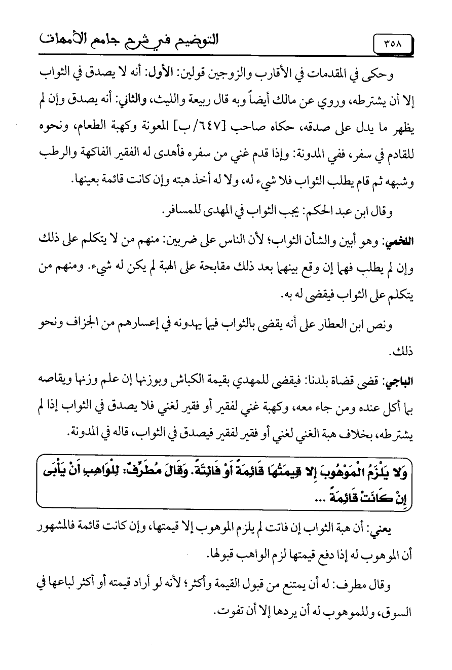 وَلا يَلْزَمُ الْمَوْهُوبَ إِلا قِيمَتُهَا قَائِمَةً أَوْ فَائِتَةً. وَقَالَ مُطَرِّفٌ: لِلْوَاهِبِ أَنْ يَابَى إِنْ كَانَتْ قَائِمةً ...