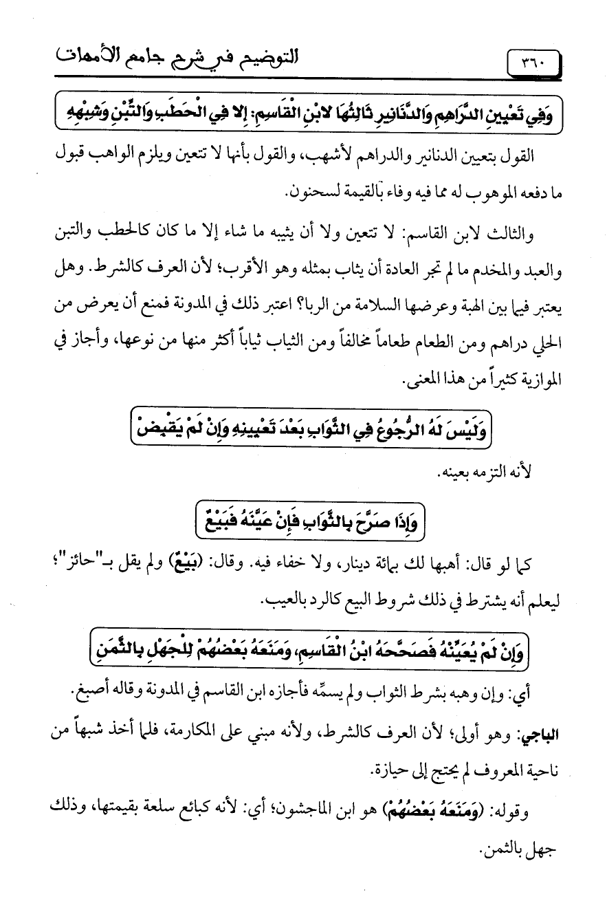 وَفِي تَعْيِينِ الدَّرَاهِمِ وَالدَّنَانِيرِ ثَالِثُهَا لابْنِ الْقَاسِمِ: إِلا فِي الْحَطَبِ وَالتِّبْنِ وَشِبْهِهِ
