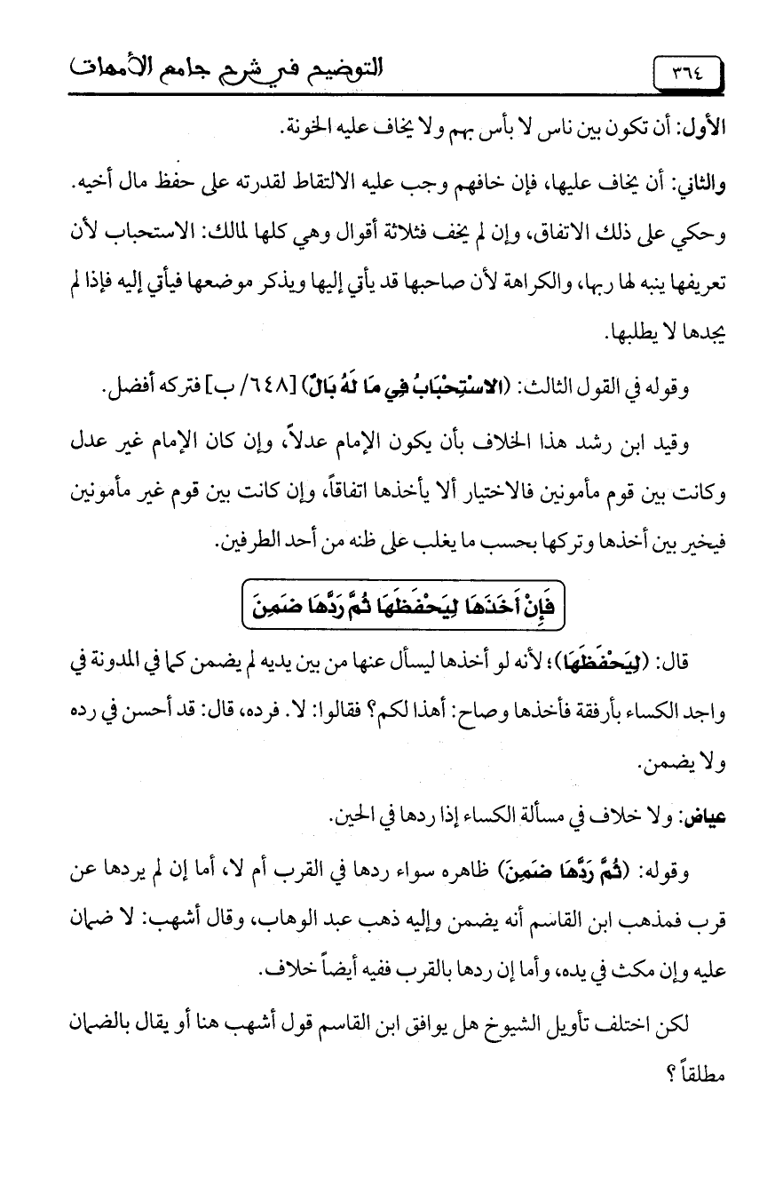 والثاني: أن يخاف عليها، فإن خافهم وجب عليه الالتقاط لقدرته على حفظ مال أخيه. وحكي على ذلك الاتفاق، وإن لم يخف فثلاثة أقوال وهي كلها لمالك: الاستحباب لأن تعريفها ينبه لها ربها، والكراهة لأن صاحبها قد يأتي إليها ويذكر موضعها فيأتي إليه فإذا لم يجدها لا يطلبها.