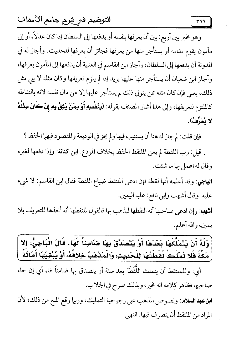 ابن عبد السلام: ونصوص المذهب على رجوحية التمليك، وربما وقع المنع من ذلك؛ لأن المراد من الملتقط أن يتصرف فيها. انتهى.