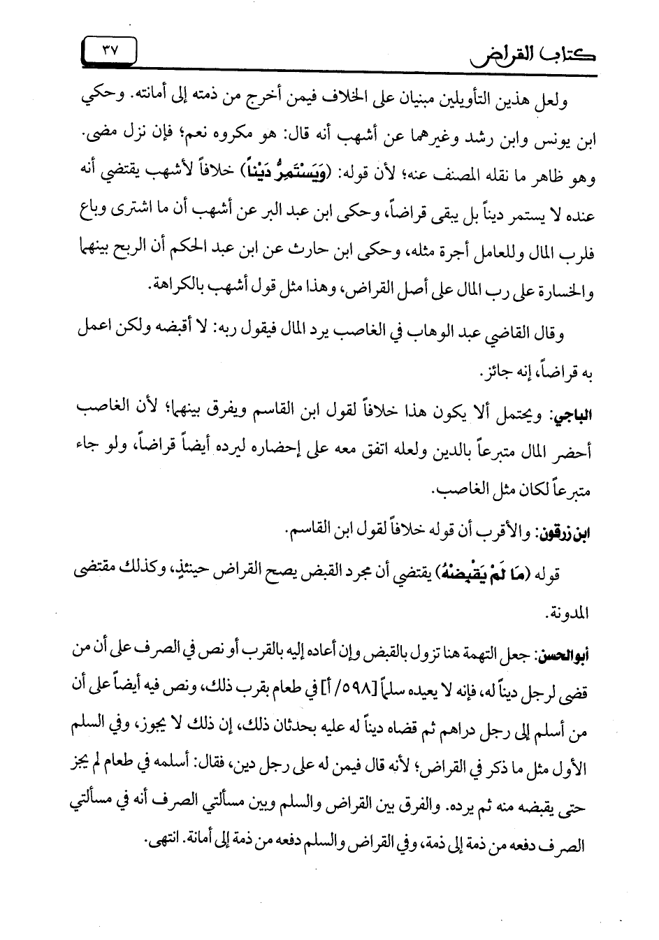 ولعل هذين التأويلين مبنيان على الخلاف فيمن أخرج من ذمته إلى أمانته. وحكي ابن يونس وابن رشد وغيرهما عن أشهب أنه قال: هو مكروه نعم؛ فإن نزل مضى. وهو ظاهر ما نقله المصنف عنه؛ لأن قوله: (ويَسْتَمِرُّ دَيْناً) خلافاً لأشهب يقتضي أنه عنده لا يستمر ديناً بل يبقى قراضاً، وحكى ابن عبد البر عن أشهب أن ما اشترى وباع فلرب المال وللعامل أجرة مثلهن وحكى ابن حارث عن ابن عبد الحكم أن الربح بينهما والخسارة على رب المال على أصل القراض، وهذا مثل قول أشهب بالكراهة.