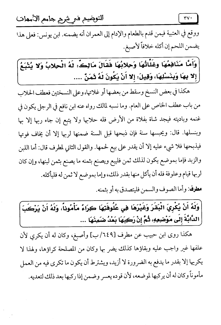 وَأَمَّا مَنَافِعُهَا وغَلَّاتُهَا وَحِلابُهَا فَقَالَ مَالِكٌ: لَهُ الْحِلابُ وَلا يُتْبَعُ إِلا بِهَا وَبِنَسْلِهَا، وَقِيلَ: إِلاأَنْ يَكُونَ لَهُ ثَمَنٌ ...