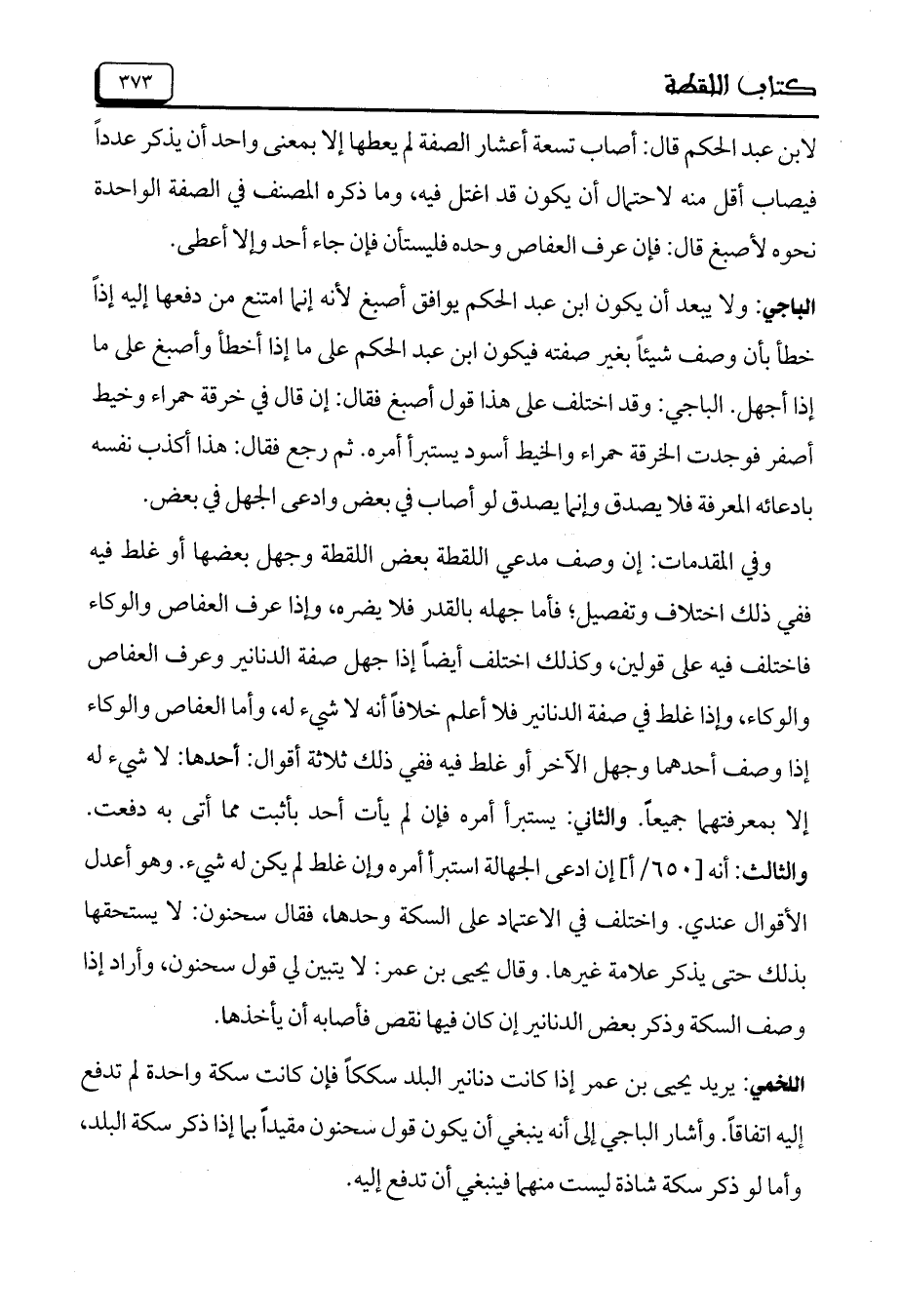 وفي المقدمات: إن وصف مدعي اللقطة بعض اللقطة وجهل بعضها أو غلط فيه ففي ذلك اختلاف وتفصيل؛ فأما جهله بالقدر فلا يضره، وإذا عرف العفاص والوكاء فاختلف فيه على قولين، وكذلك اختلف أيضاً إذا جهل صفة الدنانير وعرف العفاص والوكاء، وإذا غلط في صفة الدنانير فلا أعلم خلافاً أنه لا شيء له، وأما العفاص والوكاء إذا وصف أحدهما وجهل الآخر أو غلط فيه ففي ذلك ثلاثة أقوال: أحدها: لا شيء له إلا بمعرفتهما جميعاً. والثاني: يستبرأ أمره فإن لم يأت أحد بأثبت مما أتى به دفعت. والثالث: أنه [650/أ] إن ادعى الجهالة استبرأ أمره وإن غلط لم يكن له شيء. وهو أعدل الأقوال عندي. واختلف في الاعتماد على السكة وحدها، فقال سحنون: لا يستحقها بذلك حتى يذكر علامة غيرها. وقال يحيى بن عمر: لا يتبين لي قول سحنون، وأراد إذا وصف السكة وذكر بعض الدنانير إن كان فيها نقص فأصابه أن يأخذها.