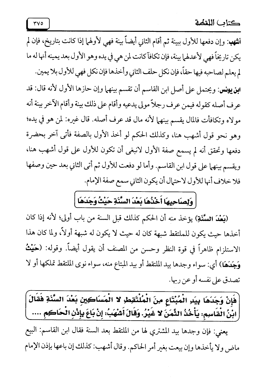 فَإِنْ وَجَدَهَا بِيَدِ الْمُبْتَاعِ مِنَ الْمُلْتَقِطِ لا الْمَسَاكِينِ بَعْدَ السَّنَةِ فَقَالَ ابْنُ الْقَاسِمِ: يَاخُذُ الثَّمَنَ لا غَيْرُ. وَقَالَ أَشْهَبُ: إِنْ بَاعَ بِإِذْنِ الْحَاكِمِ ....