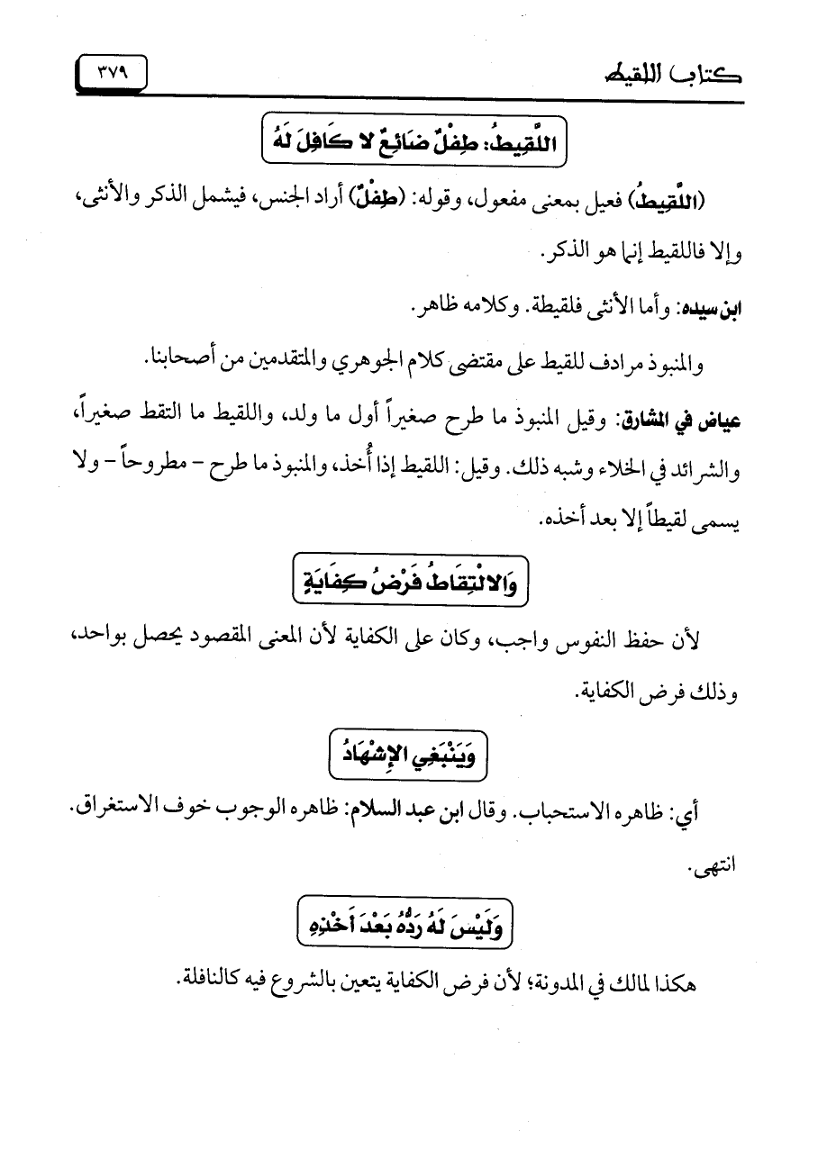 عياض في المشارق: وقيل المنبوذ ما طرح صغيراً أول ما ولد، واللقيط ما التقط صغيراً، والشرائد في الخلاء وشبه ذلك. وقيل: اللقيط إذا أُخذ، والمنبوذ ما طرح- مطروحاً- ولا يسمى لقيطاً إلا بعد أخذه.