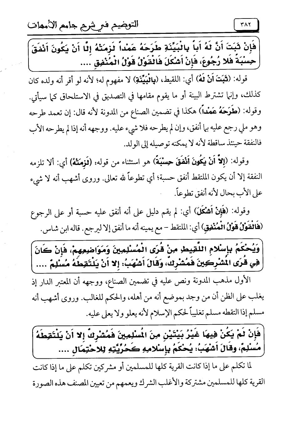 فَإِنْ لَمْ يَكُنْ فِيهَا غَيْرُ بَيْتَيْنِ مِنَ المُسْلِمِينَ فَمُشْرِكٌ إِلا أَنْ يَلْتَقِطَهُ مُسْلِمٌ، وَقَالَ أَشْهَبُ: يُحْكَمُ بِإِسْلامِهِ كَحُرِّيَّتِهِ لِلاحْتِمَالِ ....