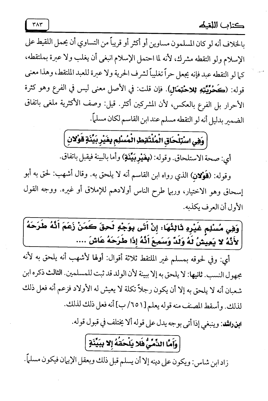 بالخلاف أنه لو كان المسلمون مساوين أو أكثر أو قريباً من التساوي أن يحمل اللقيط على الإسلام ولو التقطه مشرك، لأنه لما احتمل الإسلام انبغى أن يغلب ولا عبرة بملتقطه، كما لو التقطه عبد فإنه يجعل حراً تغليباً لشرف الحرية ولا عبرة للعبد الملتقط، وهذا معنى قوله: (كَحُرِّيَّتِهِ لِلاحْتِمَالِ). فإن قلت: في الأصل معنى ليس في الفرع وهو كثرة الأحرار بل الفرع بالعكس، لأن المشركين أكثر. قيل: وصف الأكثرية ملغى باتفاق الضمير بدليل أنه لو التقطه مسلم عند ابن القاسم لكان مسلماً.