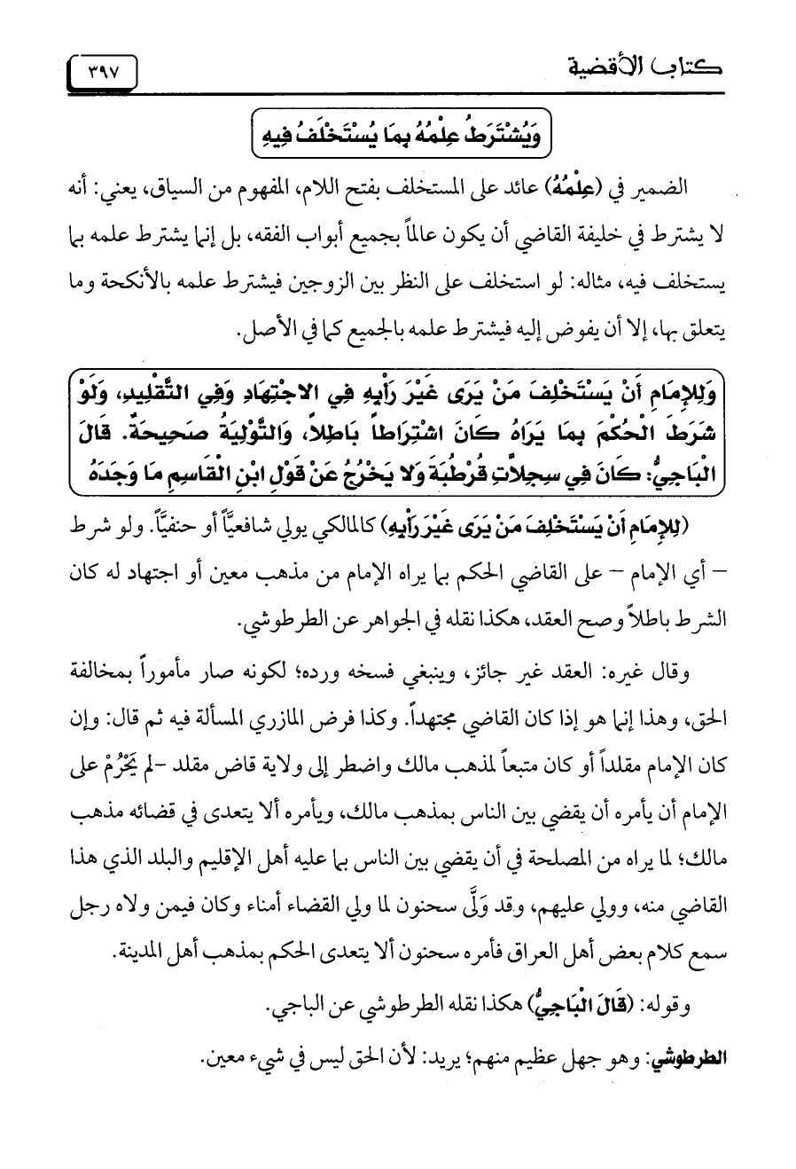 وَلِلإِمَامِ أَنْ يَسْتَخْلِفَ مَنْ يَرَى غَيْرَ رَايِهِ فِي الاجْتِهَادِ وَفِي التَّقْلِيدِ، وَلَوْ شَرَطَ الْحُكْمَ بِمَا يَرَاهُ كَانَ اشْتِرَاطاً بَاطِلاً، وَالتَّوْلِيَةُ صَحِيحَةٌ. قَالَ الْبَاجِيُّ: كَانَ فِي سِجِلَّاتِ قُرْطُبَةَ وَلا يَخْرُجُ عَنْ قَوْلِ ابْنِ الْقَاسِمِ مَا وَجَدَهُ