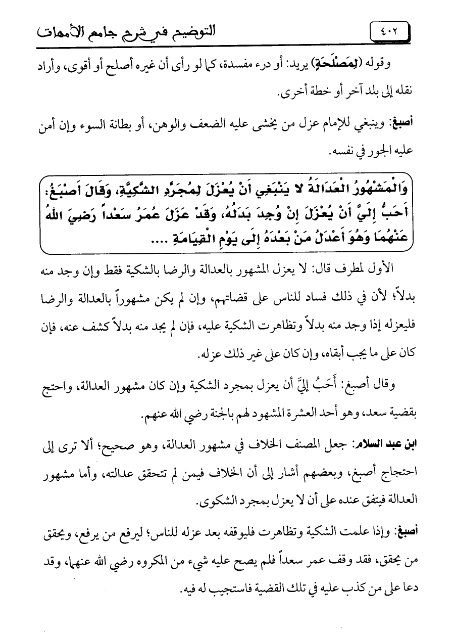 وَالْمَشْهُورُ الْعَدَالَةُ لا يَنْبَغِي أَنْ يُعْزَلَ لِمُجَرَّدِ الشَّكِيَّةِ، وَقَالَ أَصْبَغُ: أَحَبُّ إِلَيَّ أَنْ يُعْزَلَ إِنْ وُجِدَ بَدَلُهُ، وَقَدْ عَزَلَ عُمَرُ سَعْداً رَضِيَ اللهُ عَنْهُمَا وَهُوَ أَعْدَلُ مَنْ بَعْدَهُ إِلَى يَوْمِ الْقِيَامَةِ ....