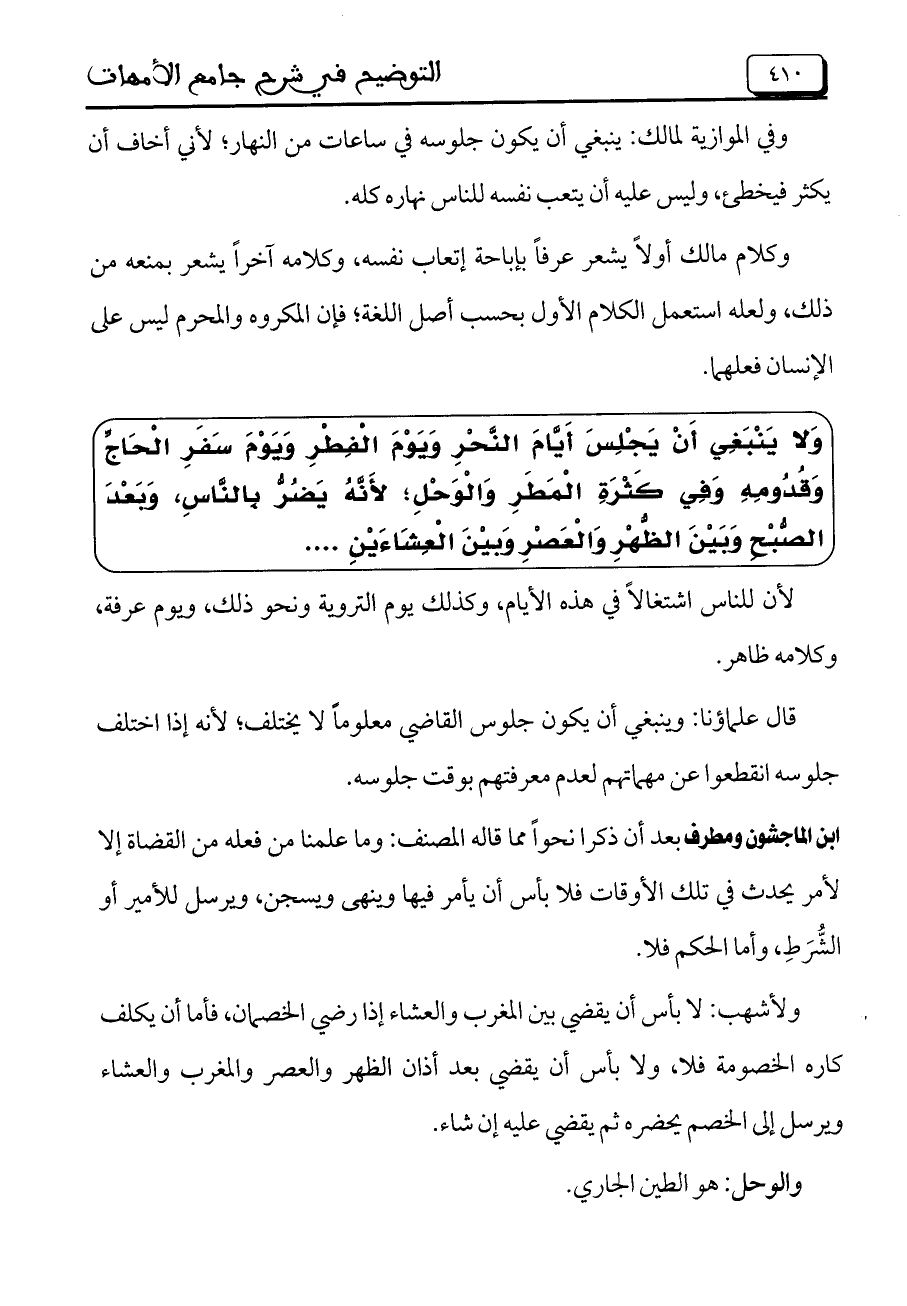 ابن الماجشون ومطرف بعد أن ذكرا نحواً مما قاله المصنف: وما علمنا من فعله من القضاة إلا لأمر يحدث في تلك الأوقات فلا بأس أن يأمر فيها وينهى ويسجن، ويرسل للأمير أو الشرط، وأما الحكم فلا.