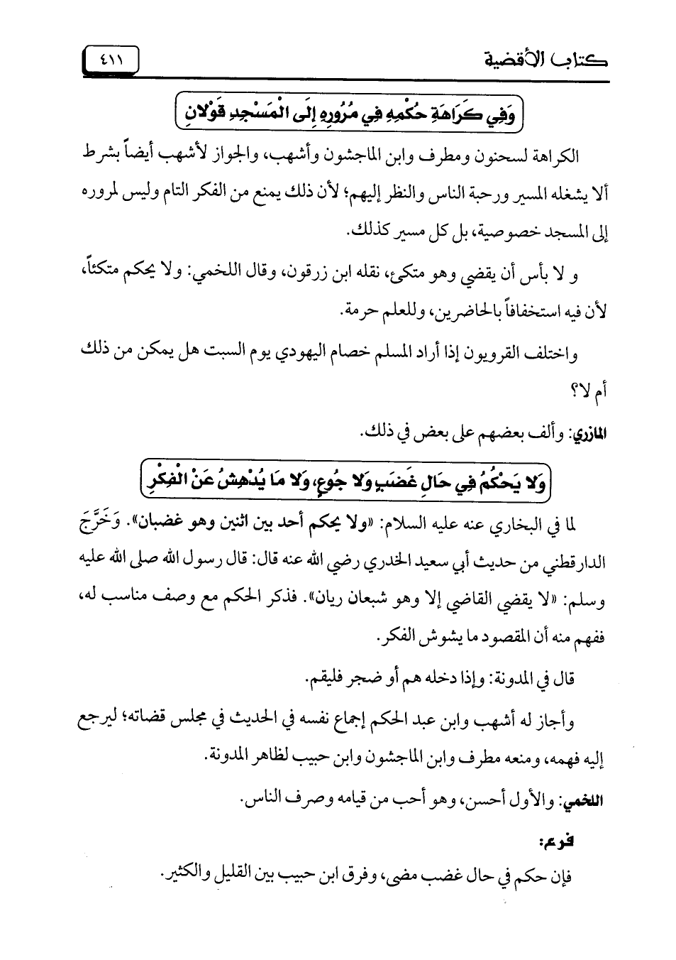 وَفِي كَرَاهَةِ حُكْمِهِ فِي مُرُورِهِ إِلَى الْمَسْجِدِ قَوْلانِ
