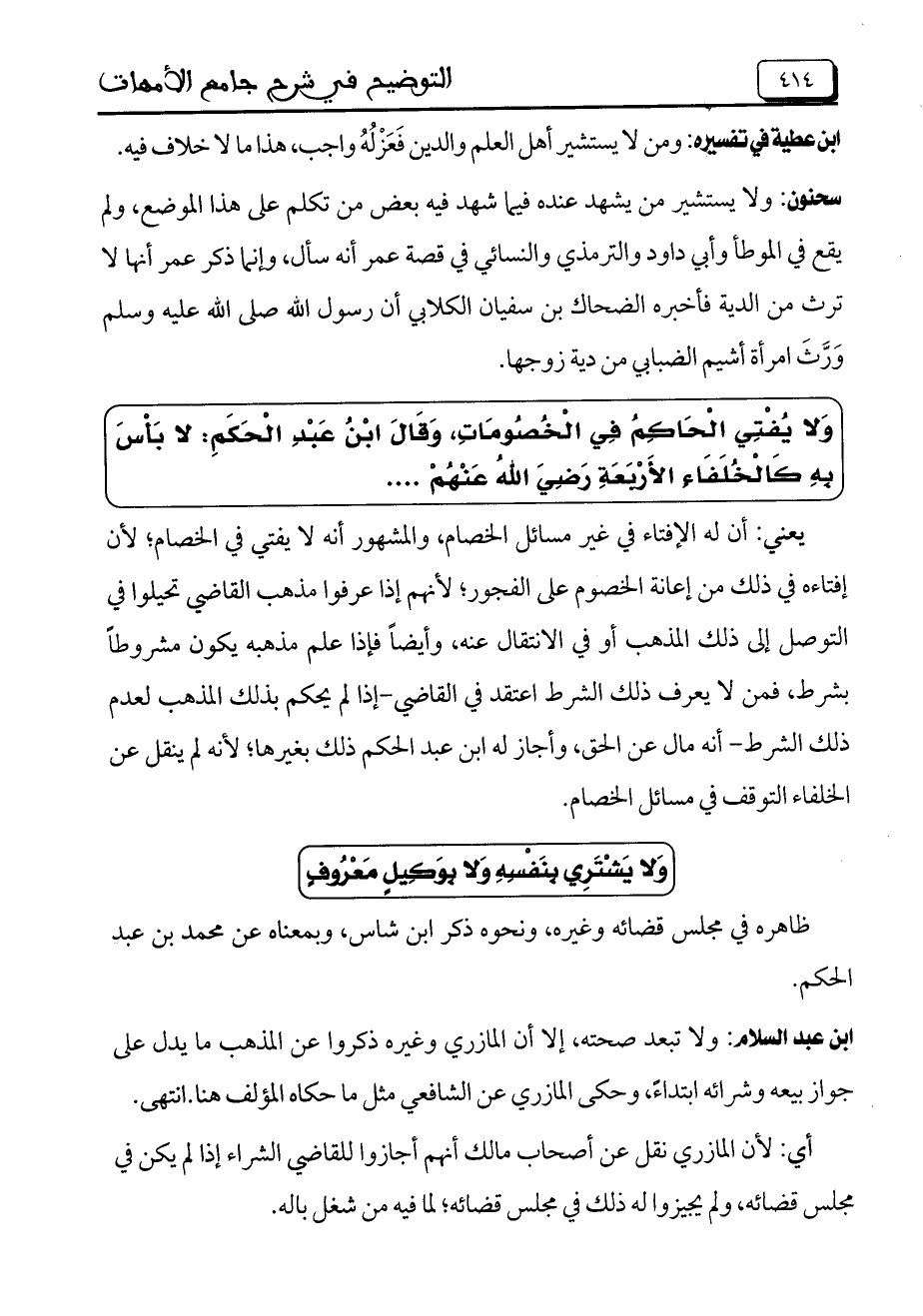 وَلا يُفْتِي الْحَاكِمُ فِي الْخُصُومَاتِ، وَقَالَ ابْنُ عَبْدِ الْحَكَمِ: لا بَاسَ بِهِ كَالْخُلَفَاءِ الأَرْبَعَةِ رَضِيَ اللهُ عَنْهُمْ ..