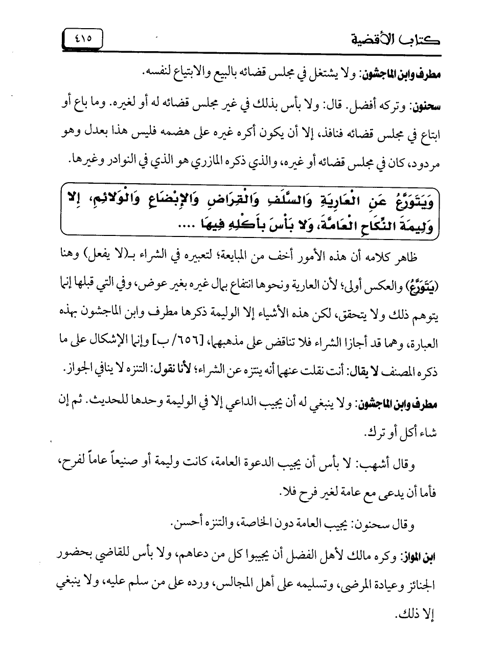 مطرف وابن الماجشون: ولا يشتغل في مجلس قضائه بالبيع والابتياع لنفسه.