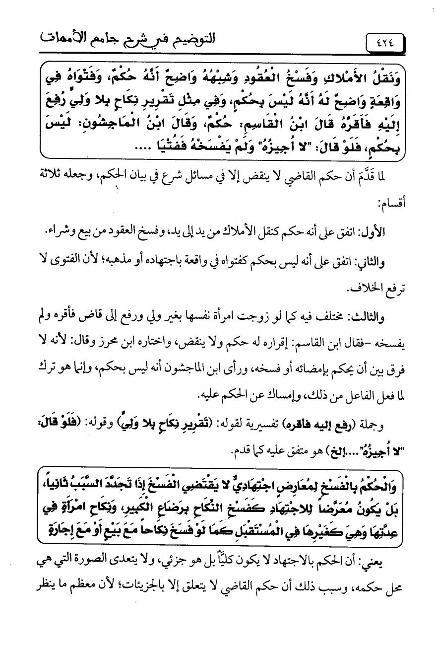 وَنَقْلُ الأَمْلاكِ وَفَسْخُ الْعُقُودِ وَشِبْهُهُ وَاضِحُ أَنَّهُ حُكْمُ، وَفَتْوَاهُ فِي وَاقِعَةٍ وَاضِحُ لَهُ أَنَّهُ لَيْسَ بِحُكْمٍ، وَفِي مِثْلِ تَقْرِيرِ نِكَاحٍ بِلا وَلِيِّ رُفِعَ إِلَيْهِ فَأَقَرَّهُ قَالَ ابن القاسم: حُكْمُ، وَقَالَ ابن الماجشون: لَيْسَ بِحُكْمٍ، فَلَوْ قَالَ: "لا أُجِيزُهُ" وَلَمْ يَفْسَخْهُ فَفُتْيَا ..