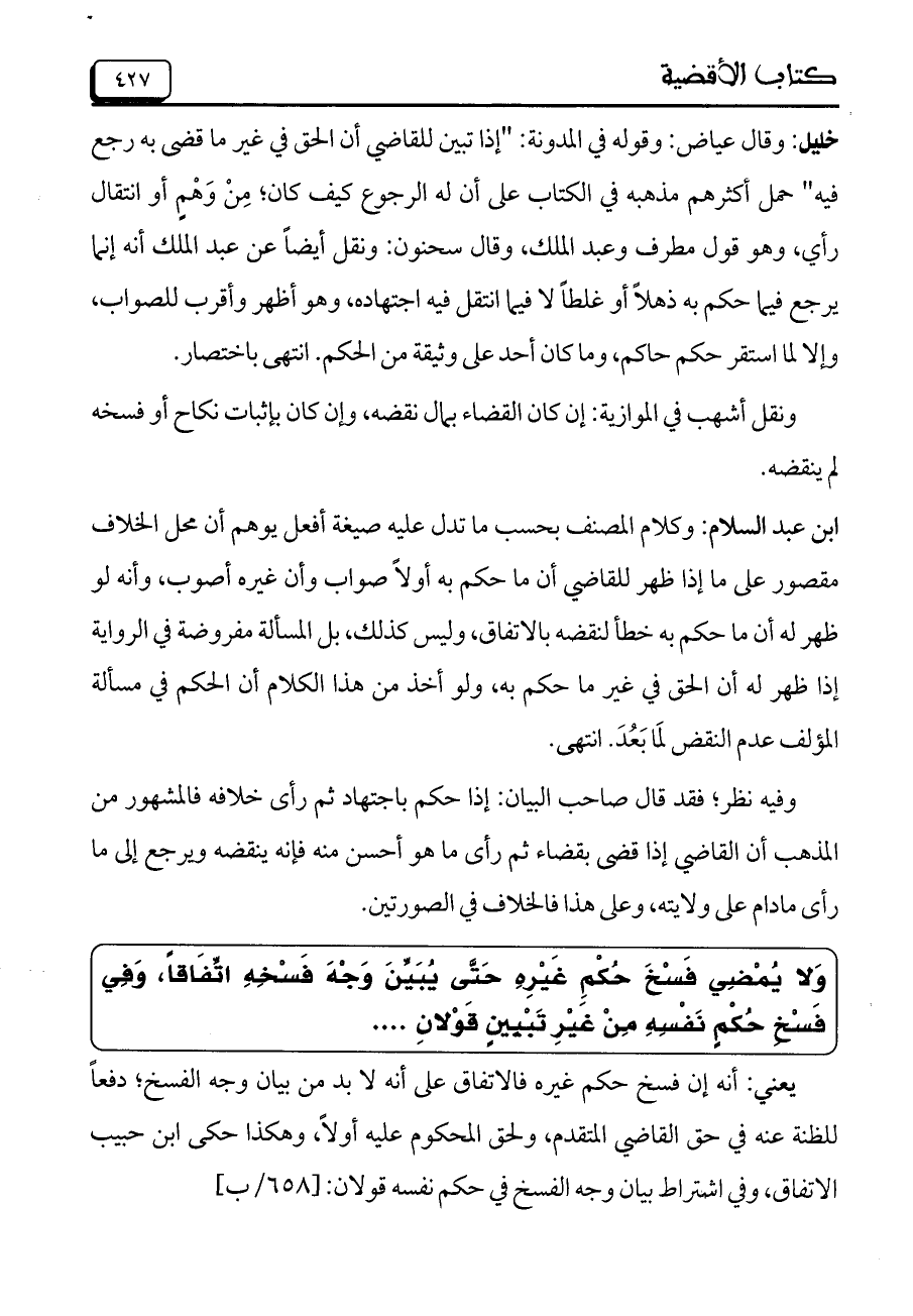 خليل: وقال عياض: وقوله في المدونة: "إذا تبين للقاضي أن الحق في غير ما قضى به رجع فيه "حمل أكثرهم مذهبه في الكتاب على أن له الرجوع كيف كان؛ من وهم أو انتقال رأي، وهو قول مطرف وعبد الملك، وقال سحنون: ونقل أيضاً عن عبد الملك أنه إنما يرجع فيما حكم به ذهلاً أو غلطاً لا فيما انتقل فيه اجتهاده، وهو أظهر وأقرب للصواب، وإلا لما استقر حكم حاكم وما كان أحد على وثيقة من الحكم. انتهى باختصار.