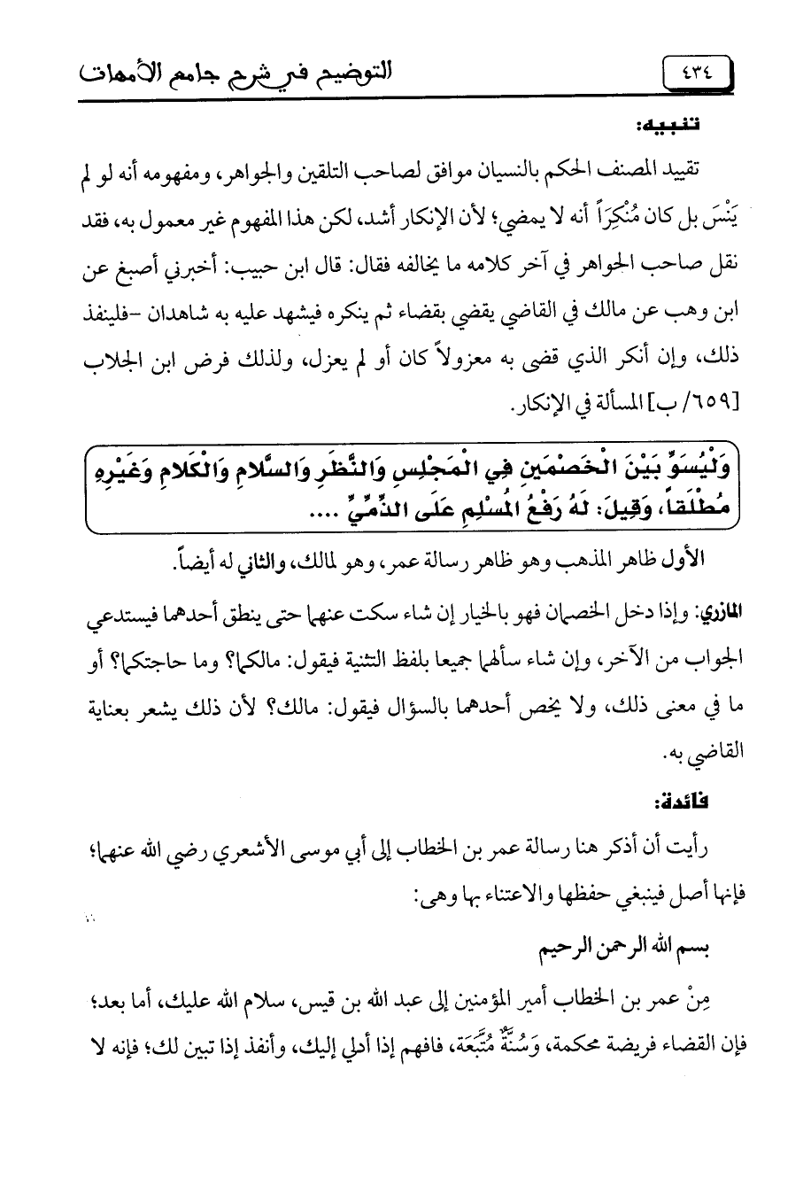 رأيت أن أذكر هنا رسالة عمر بن الخطاب إلى أبي موسى الأشعري رضي الله عنهما؛ فإنها أصل فينبغي حفظها والاعتناء بها وهي:
