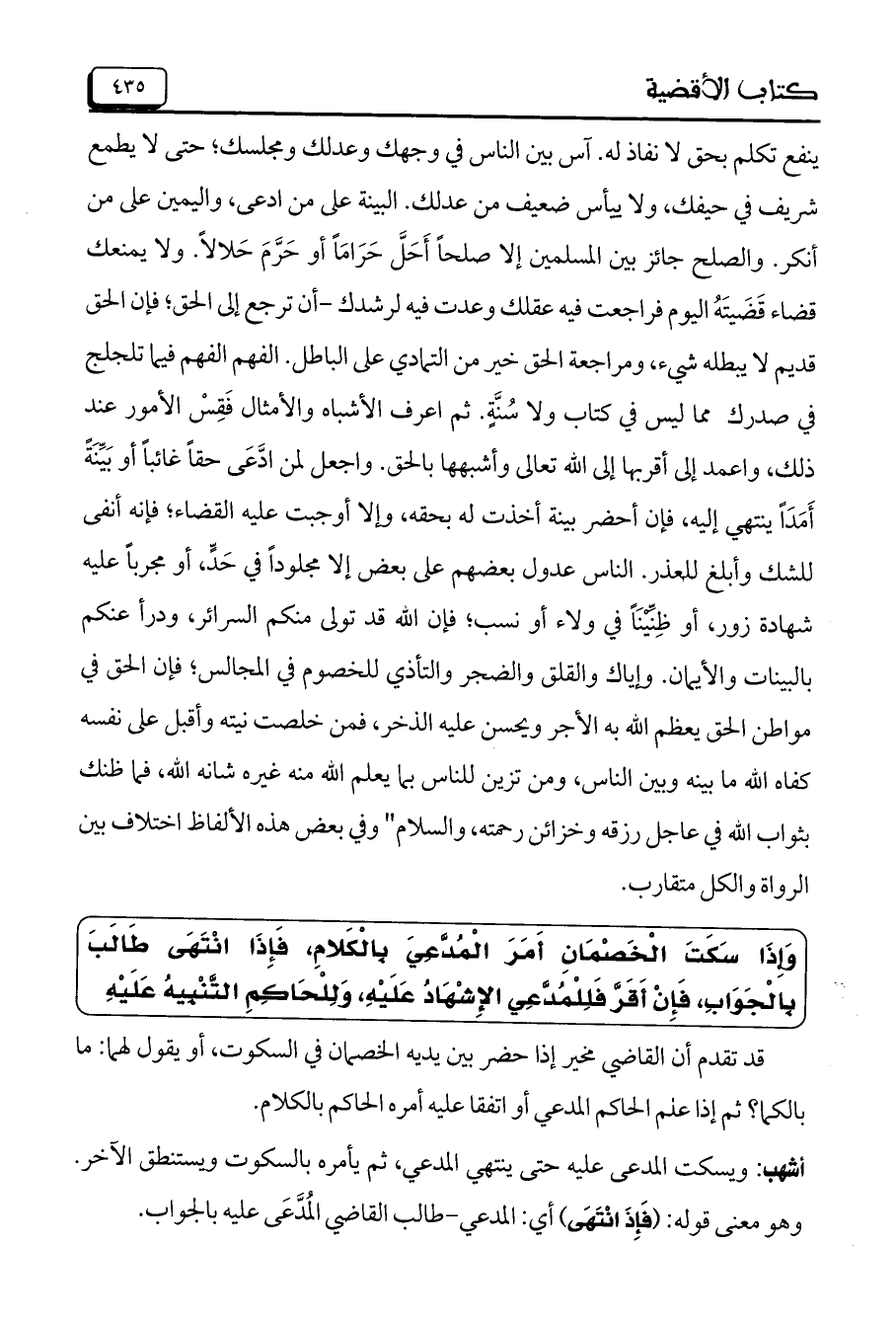 ينفع تكلم بحق لا نفاذ له. آس بين الناس في وجهك وعدلك ومجلسك، حتى لا يطمع شريف في حيفك، ولا ييأس ضعيف من عدلك. البينة على من ادعى، واليمين على من أنكر. والصلح جائز بين المسلمين إلا صلحاً أحل حراماً أو حرم حلالا. ولا يمنعك قضاء قضيته اليوم فراجعت فيه عقلك وعدت فيه لرشدك- أن ترجع إلى الحق؛ فإن الحق قديم لا يبطله شيء، ومراجعة الحق خير من التمادي على الباطل. الفهم الفهم فيما تلجلج في صدرك مما ليس في كتاب ولا سنة. ثم اعرف الأشباه والأمثال فقس الأمور عند ذلك، واعمد إلى أقربها إلى الله تعالى وأشبهها بالحق. واجعل لمن ادعى حقاً غائباً أو بينة أمداً ينتهي إليه، فإن أحضر بينة أخذت له بحقه، وإلا أوجبت عليه القضاء؛ فإنه أنفى للشك وأبلغ للعذر. الناس عدول بعضهم على بعض إلا مجلوداً في حد، أو مجرباً عليه شهادة زور، أو ظنينا في ولاء أو نسب؛ فإن الله قد تولى منكم السرائر، ودرأ عنكم بالبينات والأيمان. وإياك والقلق والضجر والتأذي للخصوم في المجالس؛ فإن الحق في مواطن الحق يعظم الله به الأجر ويحسن عليه الذخر، فمن خلصت نيته وأقبل على نفسه كفاه الله ما بينه وبين الناس، ومن تزين للناس بما يعلم الله منه غيره شانه الله، فما ظنك بثواب الله في عاجل رزقه وخزائن رحمته، والسلام وفي بعض هذه الألفاظ اختلاف بين الرواة والكل متقارب.