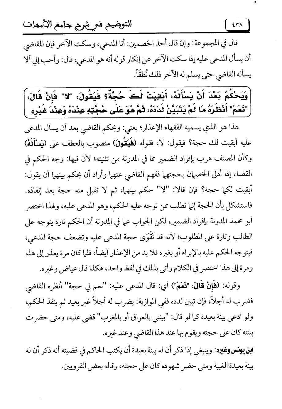 هذا هو الذي يسميه الفقهاء الإعذار؛ يعني: ويحكم القاضي بعد أن يسأل المدعى عليه أبقيت لك حجة؟ فيقول: لا، فقوله (فَيَقُولَ) منصوب بالعطف على (يَسْأَلَهُ) وكأن المصنف هرب بإفراد الضمير مما في المدونة من تثنيته؛ لأن فيها: وجه الحكم في القضاء إذا أدلى الخصمان بحجتهما ففهم القاضي عنهما وأراد أن يحكم بينهما أن يقول: أبقيت لكما حجة؟ فإن قالا: "لا" حكم بينهما، ثم لا تقبل منه حجة بعد إنفاذه. فاستشكل بأن الحجة إنما تطلب ممن توجه عليه الحكم، وهو المدعى عليه، ولهذا اختصر أبو محمد المدونة بإفراد الضمير، لكن الجواب عما في المدونة أن الحكم تارة يتوجه على الطالب وتارة على المطلوب؛ لأنه قد تقوى حجة المدعى عليه وتضعف حجة المدعي، فيتوجه الحكم عليه بالإبراء أو بغيره فلابد من الإعذار أيضاً، فلما كان مرة يعذر إلى هذا ومرة إلى هذا اختصر في الكلام وأتى بذلك في لفظ واحد، هكذا قال عياض وغيره.