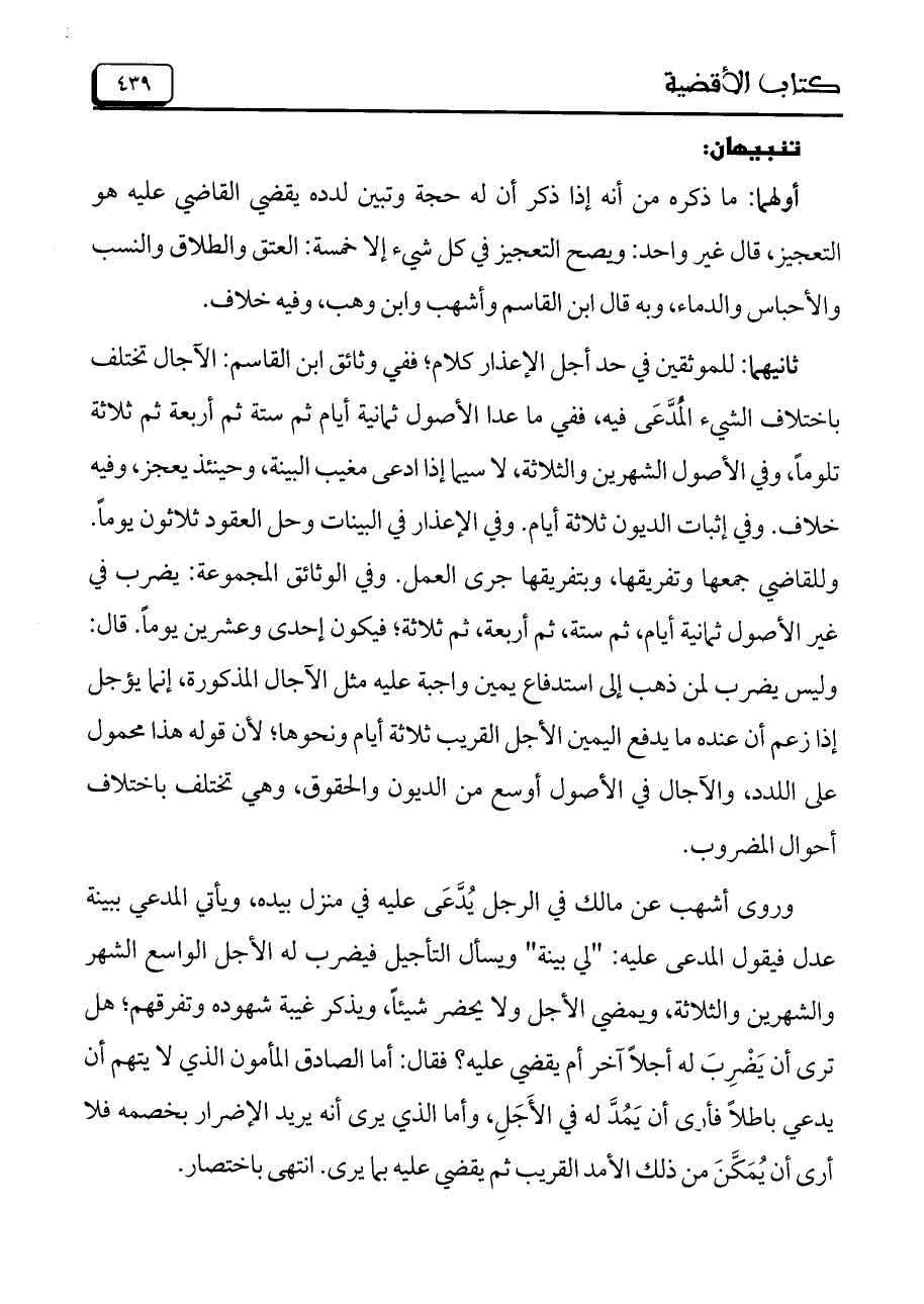 ثانيهما: للموثقين في حد أجل الإعذار كلام؛ ففي وثائق ابن القاسم: الآجال تختلف باختلاف الشيء المدعى فيه، ففي ما عدا الأصول ثمانية أيام ثم ستة ثم أربعة ثم ثلاثة تلوماً، وفي الأصول الشهرين والثلاثة، لاسيما إذا ادعى مغيب البينة، وحينئذ يعجز، وفيه خلاف. وفي إثبات الديون ثلاثة أيام. وفي الإعذار في البينات وحل العقود ثلاثون يوماً. وللقاضي جمعها وتفريقها، وبتفريقها جرى العمل. وفي الوثائق المجموعة: يضرب في غير الأصول ثمانية أيام، ثم ستة، ثم أربعة، ثم ثلاثة؛ فيكون إحدى وعشرين يوماً. قال: وليس يضرب لمن ذهب إلى استدفاع يمين واجبة عليه مثل الآجال المذكورة، إنما يؤجل إذا زعم أن عنده ما يدفع اليمين الأجل القريب ثلاثة أيام ونحوها؛ لأن قوله هذا محمول على اللدد، وألآجال في الأصول أوسع من الديون والحقوق، وهي تختلف باختلاف أحوال المضروب.