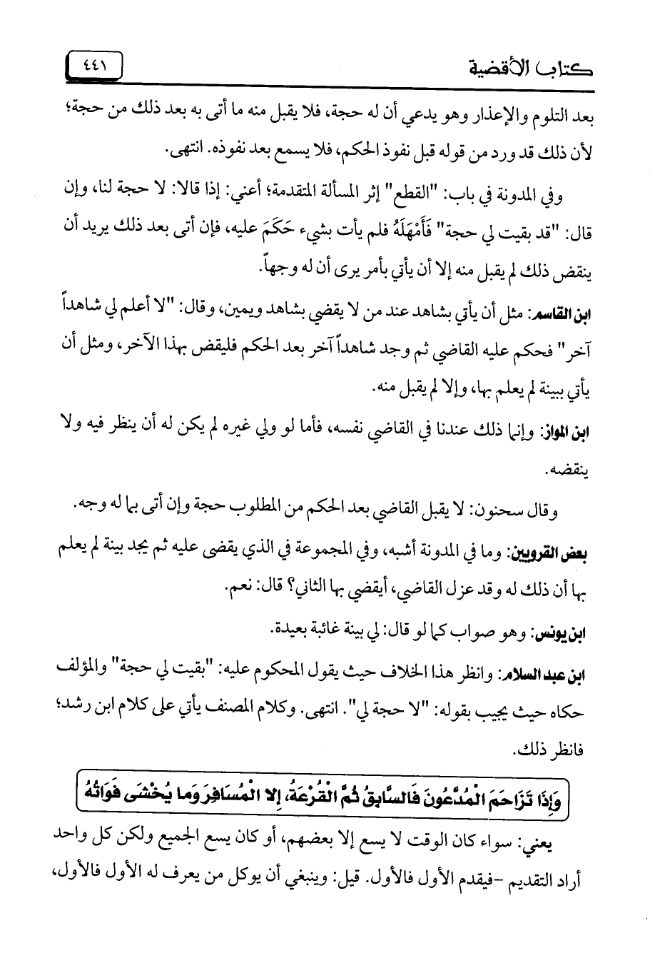 ابن عبد السلام: وانظر هذا الخلاف حيث يقول المحكوم عليه: "بقيت لي حجة" والمؤلف حكاه حيث يجيب بقوله: "لا حجة لي". انتهى. وكلام المصنف يأتي على كلام ابن رشد؛ فانظر ذلك.