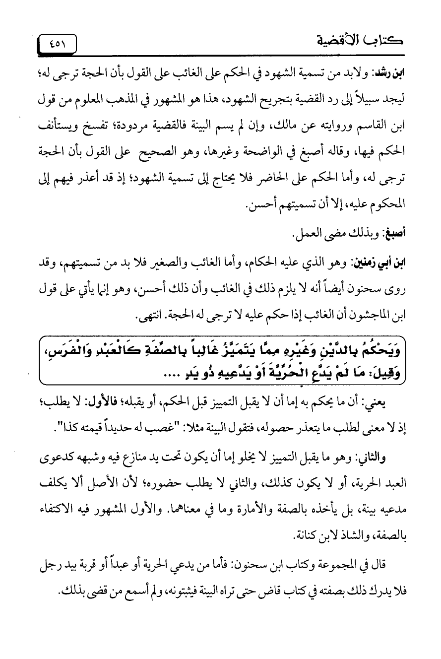 ابن رشد: ولابد من تسمية الشهود في الحكم على الغائب على القول بأن الحجة ترجى له؛ ليجد سبيلاً إلى رد القضية بتجريح الشهود، هذا هو المشهور في المذهب المعلوم من قول ابن القاسم وروايته عن مالك، وإن لم يسم البينة فالقضية مردودة؛ تفسخ ويستأنف الحكم فيها، وقاله أصبغ في الواضحة وغيرها، وهو الصحيح على القول بأن الحجة ترجى له، وأما الحكم على الحاضر فلا يحتاج إلى تسمية الشهود؛ إذ قد أعذر فيهم إلى المحكوم عليه، إلا أن تسميتهم أحسن.