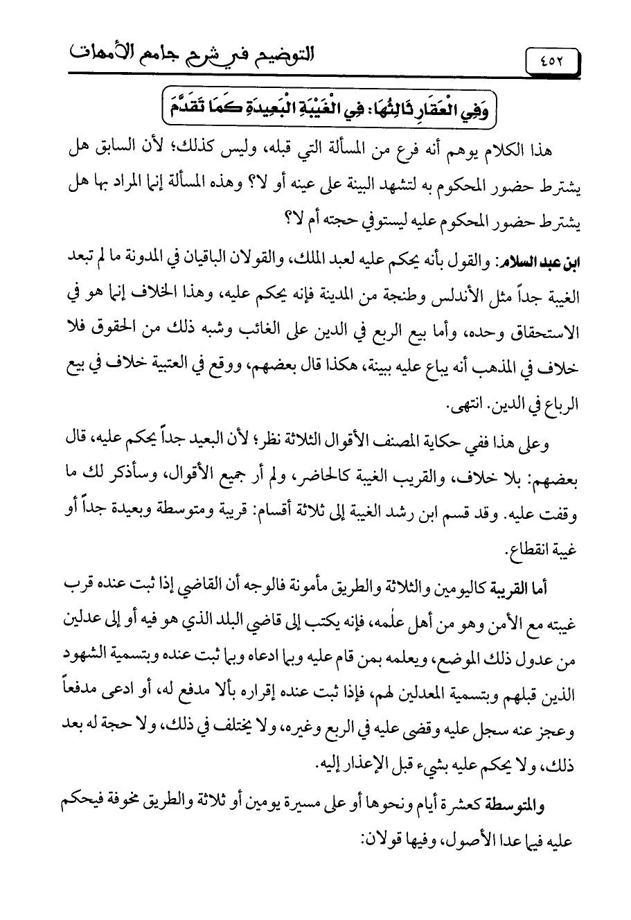 ابن عبد السلام: والقول بأنه يحكم عليه لعبد الملك، والقولان الباقيان في المدونة ما لم تبعد الغيبة جداً مثل الأندلس وطنجة من المدينة فإنه يحكم عليه، وهذا الخلاف إنما هو في الاستحقاق وحده، وأما بيع الربع في الدين على الغائب وشبه ذلك من الحقوق فلا خلاف في المذهب أنه يباع عليه بينة، هكذا قال بعضهم، ووقع في العتبية خلاف في بيع الرباع في الدين. انتهى.