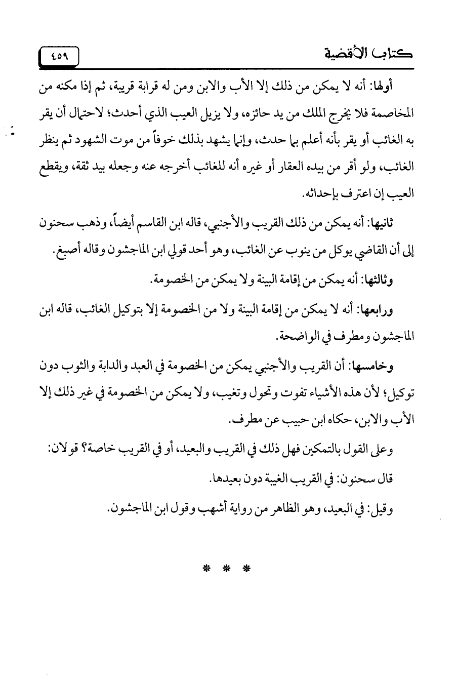 ثانيها: أنه يمكن من ذلك القريب والأجنبي، قاله ابن القاسم أيضاً، وذهب سحنون إلى أن القاضي يوكل من ينوب عن الغائب، وهو أحد قولي ابن الماجشون وقاله أصبغ.