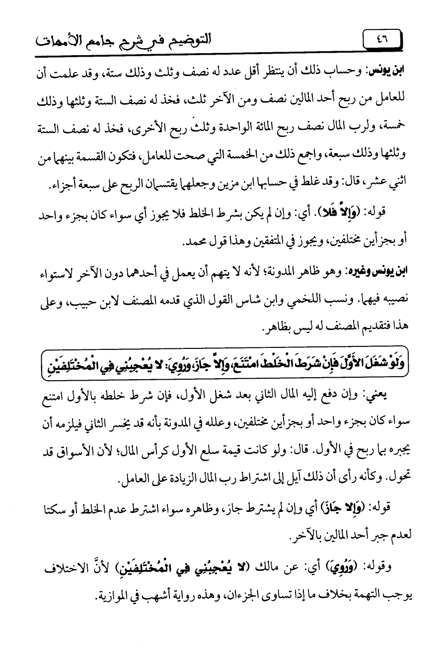 ابن يونس: وحساب ذلك أن ينتظر أقل عدد له نصف وثلث وذلك ستة، وقد علمت أن للعامل من ربح أحد المالين نصف ومن الآخر ثلث، فخذ له نصف الستة وثلثها وذلك خمسة، ولرب المال نصف ربح المائة الواحدة وثلث ربح الأخرى، فخذ له نصف الستة وثلثها وذلك سبعة، واجمع ذلك من الخمسة التي صحت للعامل، فتكون القسمة بينهما من اثني عشر، قال: وقد غلط في حسابها ابن مزين وجعلهما يقتسمان الربح على سبعة أجزاء.