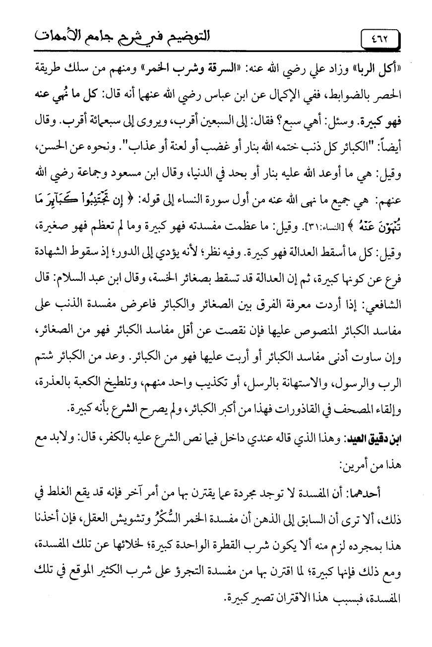 "أكل الربا" وزاد علي رضي الله عنه: "السرقة وشرب الخمر" ومنهم من سلك طريقة الحصر بالضوابط، ففي الإكمال عن ابن عباس رضي الله عنهما أنه قال: كل ما نهي عنه فهو كبيرة. وسئل: أهي سبع؟ فقال: إلى السبعين أقرب، ويروى إلى سبعمائة أقرب. وقال أيضاً: "الكبائر كل ذنب ختمه الله بنار أو غضب أو لعنة أو عذاب" ونحوه عن الحسن، وقيل: هي ما أوعد الله عليه بنار أو بحد في الدنيا، وقال ابن مسعود وجماعة رضي الله عنهم: هي جميع ما نهى الله عنه من أول سورة النساء إلى قوله: (إِنْ تَجْتَنِبُوا كَبَائِرَ مَا تُنْهَوْنَ عَنْهُ) [النساء: 31] وقيل: ما عظمت مفسدته فهو كبيرة وما لم تعظم فهو صغيرة، وقيل: كل ما أسقط العدالة فهو كبيرة. وفيه نظر؛ لأنه يؤدي إلى الدور؛ إذ سقوط الشهادة فرع عن كونها كبيرة، ثم إن العدالة قد تسقط بصغائر الخسة، وقال ابن عبد السلام: قال الشافعي: إذا أردت معرفة الفرق بين الصغائر والكبائر فاعرض مفسدة الذنب على مفاسد الكبائر المنصوص عليها فإن نقصت عن أقل مفاسد الكبائر فهو من الصغائر، وإن ساوت أدنى مفاسد الكبائر أو أربت عليها فهو من الكبائر. وعد من الكبائر شتم الرب والرسول، والاستهانة بالرسل، أو تكذيب واحد منهم، وتلطيخ الكعبة بالعذرة، وإلقاء المصحف في القاذورات فهذا من أكبر الكبائر، ولم يصرح الشرع بأنه كبيرة.