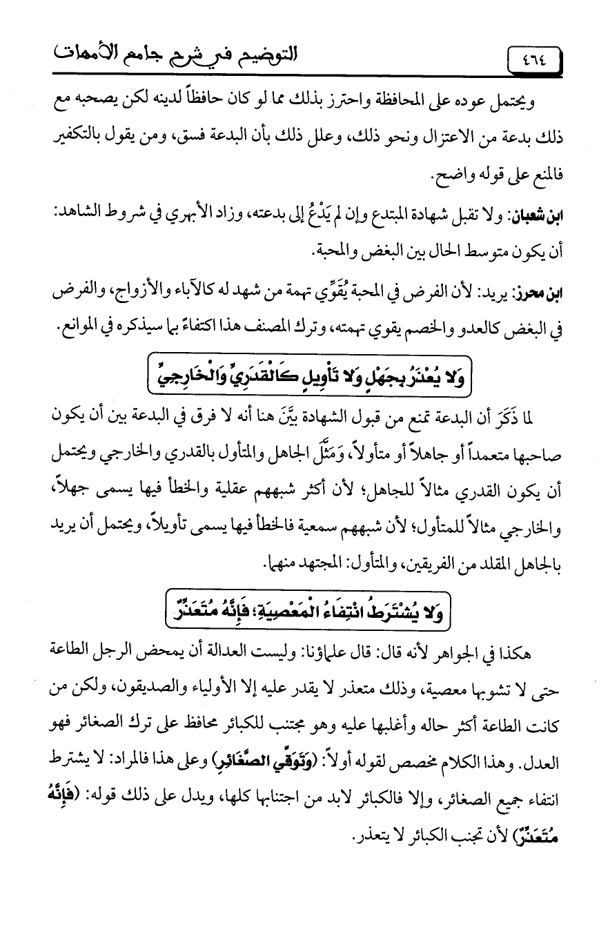 ابن شعبان: ولا تقبل شهادة المبتدع وإن لم يدع إلى بدعته، وزاد الأبهري في شروط الشاهد: أن يكون متوسط الحال بين البغض والمحبة.