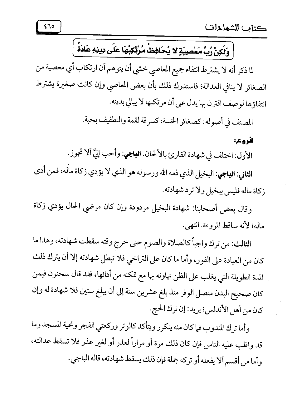 الثالث: من ترك واجباً كالصلاة والصوم حتى خرج وقته سقطت شهادته، وهذا ما كان من العبادة على الفور، وأما ما كان على التراخي فلا تبطل شهادته إلا أن يترك ذلك المدة الطويلة التي يغلب على الظن تهاونه بها مع تمكنه من أدائها، فقد قال سحنون فيمن كان صحيح البدن متصل الوفر منذ بلغ عشرين سنة إلى أن يبلغ ستين فلا شهادة له وإن كان من أهل الأندلس؛ يريد: إن ترك الحج.