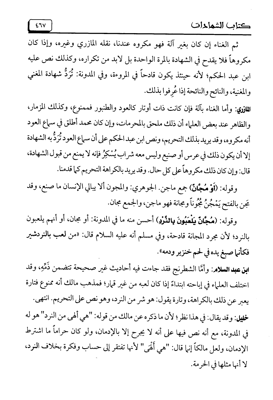 خليل: وقد يقال: في هذا نظر؛ لأن ما ذكره عن مالك من قوله: "هي ألهي من النرد" هو له في المدونة، مع أنه نص فيها على أنه لا يجرح إلا بالإدمان، ولو كان حراماً ما اشترط الإدمان، ولعل مالكاً إنما قال: "هي ألهى" لأنها تفتقر إلى حساب وفكرة بخلاف النرد، لا أنها مثلها في الحرمة.