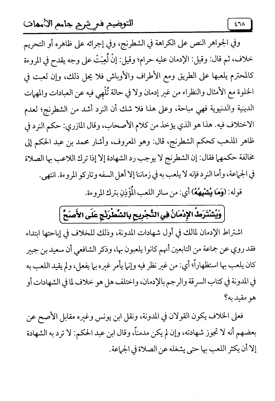 اشتراط الإدمان لمالك في أول شهادات المدونة، وذلك للخلاف في إباحتها ابتداء فقد روي عن جماعة من التابعين أنهم كانوا يلعبون بها، وذكر الشافعي أن سعيد بن جبير كان يلعب بها استظهاراً؛ أي: من غير نظر فيه وإنما يأمر غيره بما يفعل، ولم يقيد اللعب به في المدونة في كتاب السرقة والرجم بالإدمان، واختلف هل هو خلاف لما في الشهادات أو هو مقيد به؟