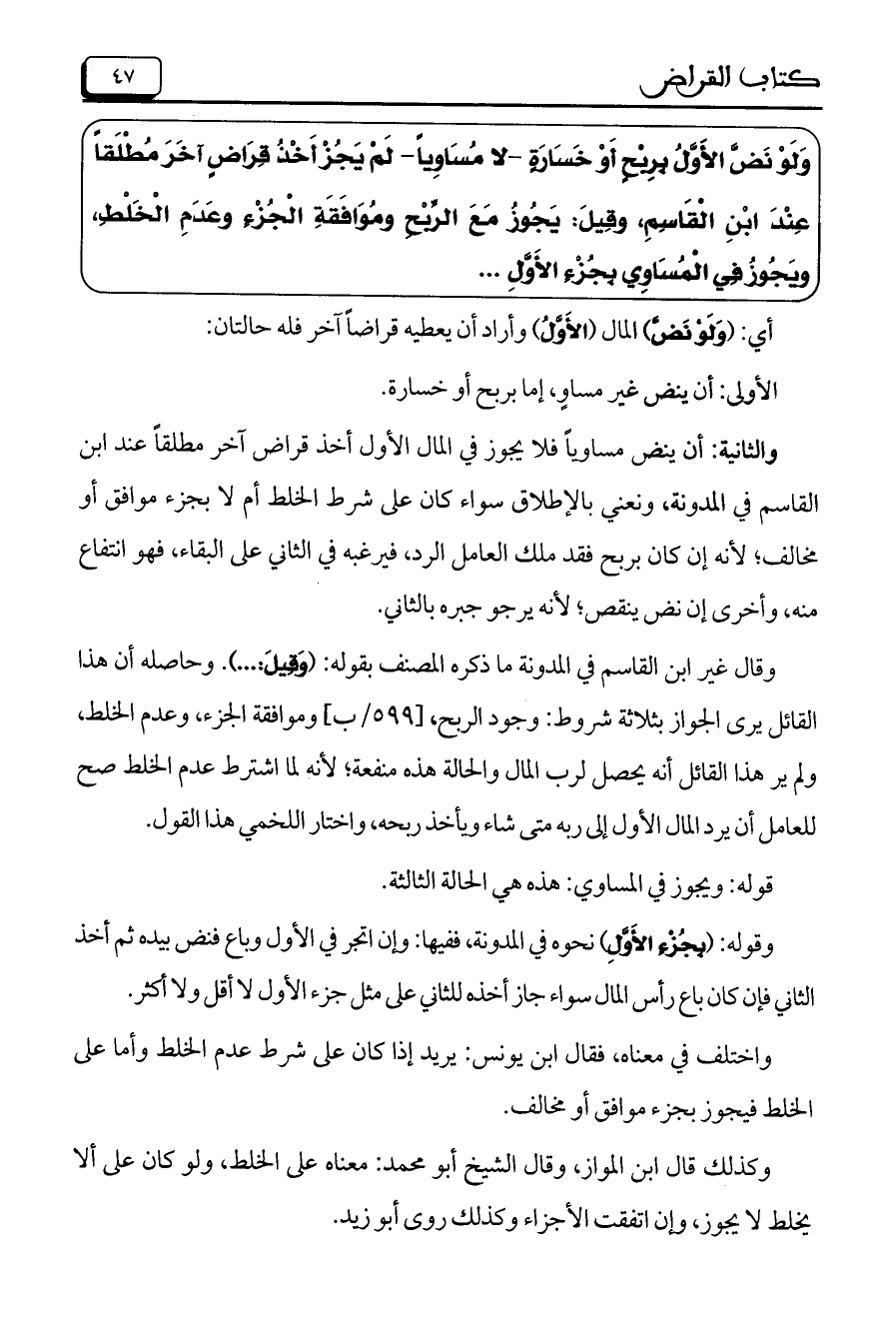 وَلَوْ نَضَّ الأَوَّلُ بِرِبْحٍ أَوْ خَسَارَةِ- لا مُسَاوِياً - لَمْ يَجُزْ أَخْذُ قِرَاضٍ آخَرَ مُطْلَقاً عِنْدَ ابْنِ الْقَاسِمِ، وقِيلَ: يَجُوزُ مَعَ الرِّبْحِ ومُوَافَقَةِ الْجُزْءِ وعَدَمِ الْخَلْطِ، ويَجُوزُ فِي الْمُسَاوِي بِجُزْءٍ الأَوَّلِ ..