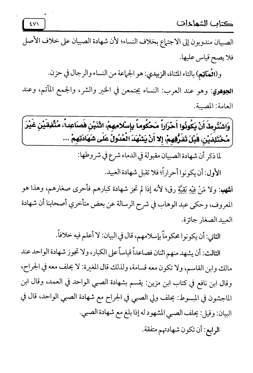 وَاشْتُرِطَ أَنْ يَكُونُوا أَحْرَاراً مَحْكُوماً بِإِسْلامِهِمُ، اثْنَيْنِ فَصَاعِداً، مُتَّفِقَيْنِ غَيْرَ مُخْتَلِفَيْنِ، قَبْلَ تَفَرُّقِهِمْ، إِلا أَنْ يَشْهَدَ الْعُدُولُ عَلَى شَهَادَتِهِمْ ...