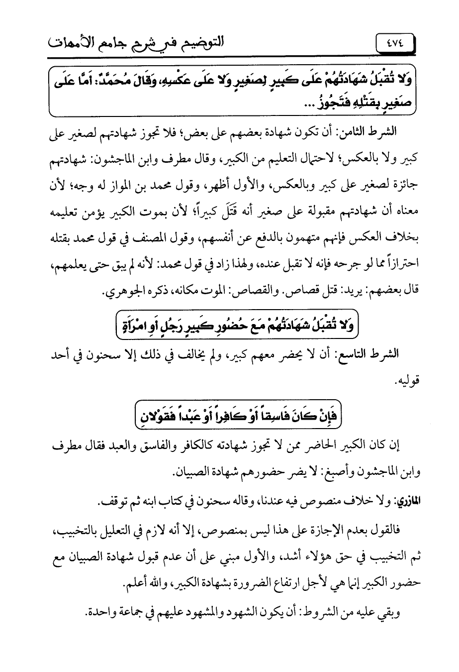 الشرط الثامن: أن تكون شهادة بعضهم على بعض؛ فلا تجوز شهادتهم لصغير على كبير ولا بالعكس؛ لاحتمال التعليم من الكبير، وقال مطرف وابن الماجشون: شهادتهم جائزة لصغير على كبير وبالعكس، والأول أظهر، وقول محمد بن المواز له وجه؛ لأن معناه أن شهادتهم مقبولة على صغير أنه قتل كبيراً؛ لأن بموت الكبير يؤمن تعليمه بخلاف العكس فإنهم متهمون بالدفع عن أنفسهم، وقول المصنف في قول محمد بقتله احترازاً مما لو جرحه فإنه لا تقبل عنده، ولهذا زاد في قول محمد: لأنه لم يبق حتى يعلمهم، قال بعضهم: يريد: قتل قصاص. والقصاص: الموت مكانه، ذكره الجوهري.